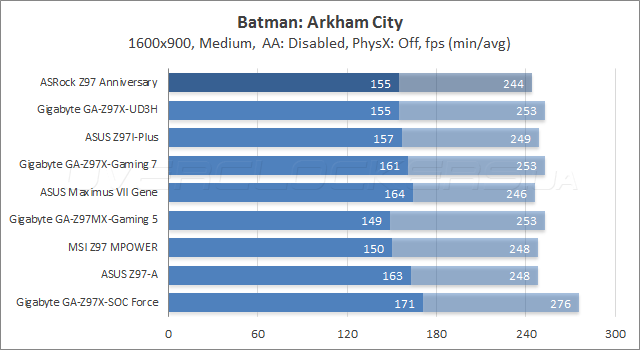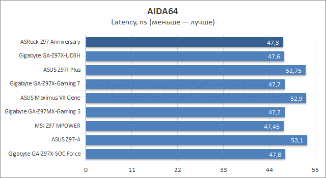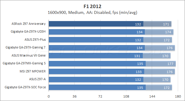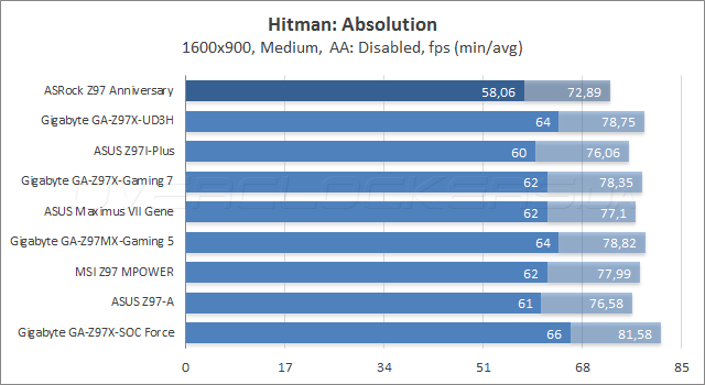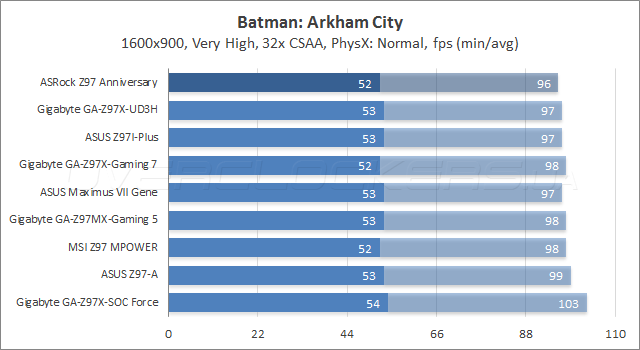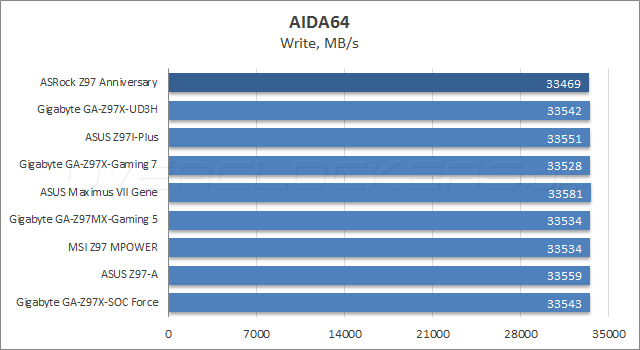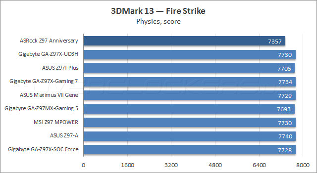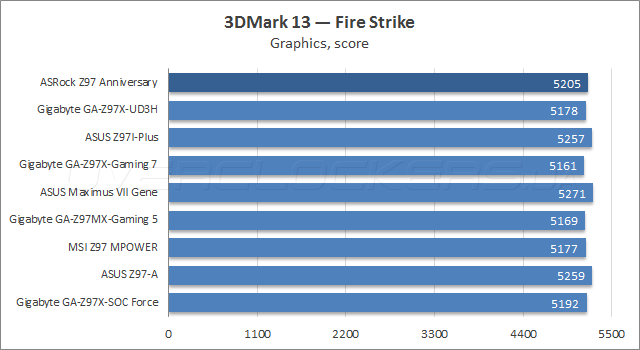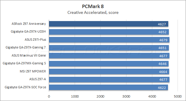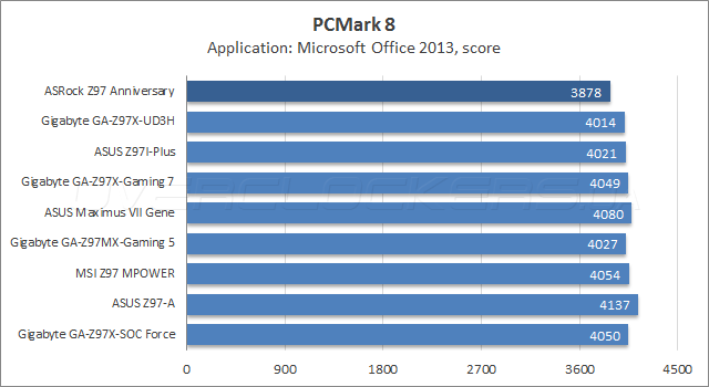 В тестовом пакете PCMark 8 Z97 Anniversary пытается удержаться на одном уровне с другими платами, серьёзно отставая лишь в откровенно процессорозависимом тесте — с привлечением MS Office.