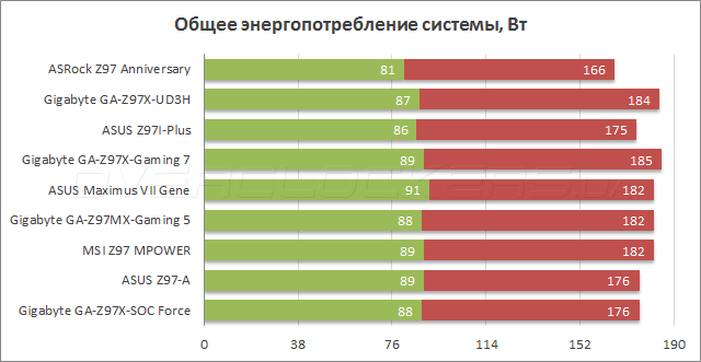 После проведённых тестов все надежды оказались разбитыми. Вроде бы всё есть для успеха у этой платы — полный спектр настроек в UEFI, внятная программная поддержка, но главным ограничивающим фактором выступила слабая подсистема питания. Двухъядерному процессору её должно хватить, но полноценный разгон Core i5 здесь осуществить не получится. С повышением частоты оперативной памяти тоже есть нюансы. Одним словом, Z97 Anniversary как по цене, так и по поведению становится в один ряд с уже упомянутой MSI Z87M-G43. Но всё ещё интересно, как она проявит себя в режиме работы по умолчанию на фоне более дорогих моделей.