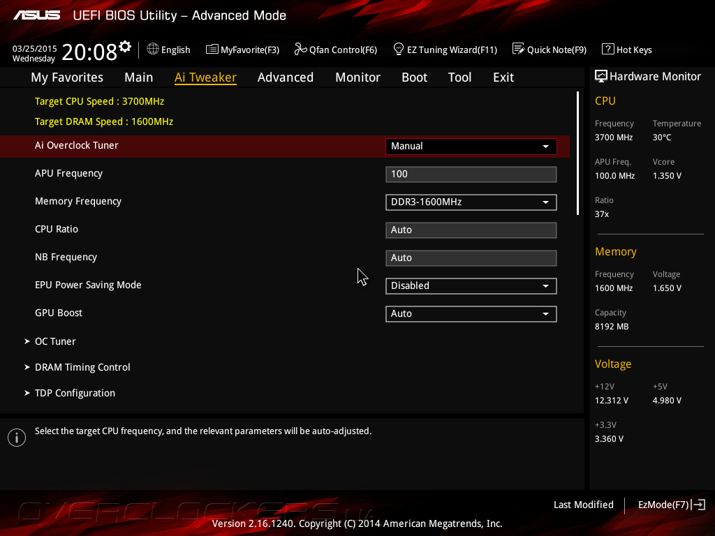 За разгон и управление параметрами производительности отвечает раздел Ai Tweaker, где находятся органы управления опорной частотой, коэффициентами умножения вычислительных модулей и встроенного северного моста центрального процессора, рабочей частотой подсистемы ОЗУ, а также настройки функции энергосбережения EPU Power Saving Mode и уровня продуктивности встроенного графического ядра. Здесь же включается функция автоматического оверклокинга OC Tuner.