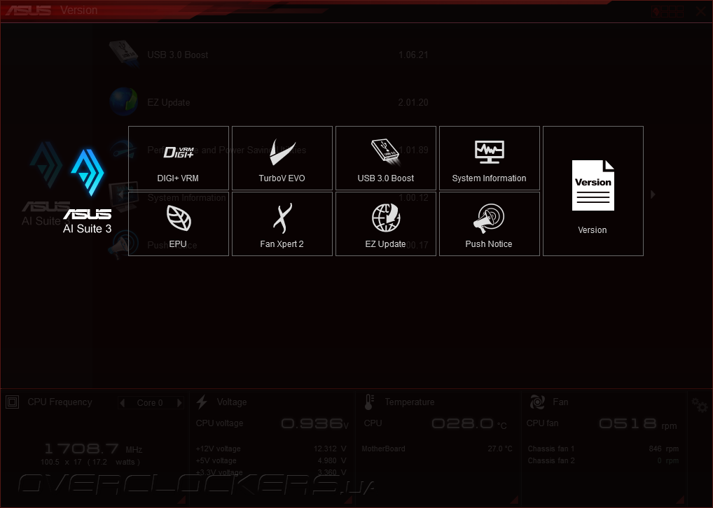 Системная плата A88X-Gamer комплектуется DVD-диском, на котором записаны все необходимые драйверы и множество полезных утилит, в том числе ASUS Ai Suite 3. Она состоит из отдельных подпрограмм, объединенных общим интерфейсом, которые предназначены для управления быстродействием, контроля показателей аппаратного мониторинга, настройки режима работы вентиляторов и много другого.