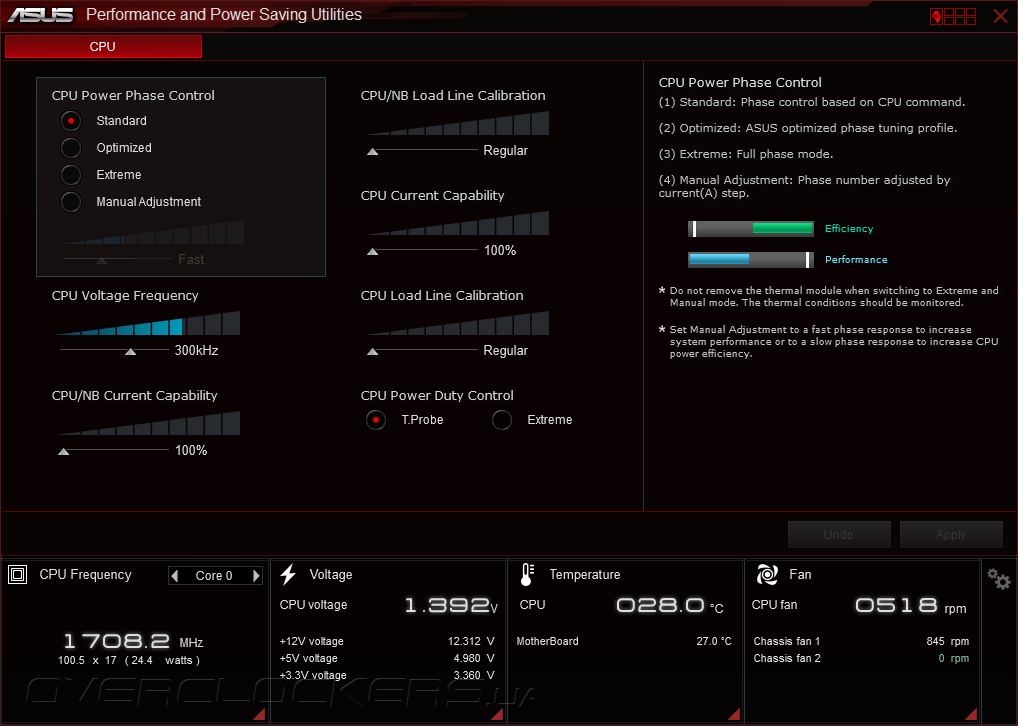 Модуль EPU отвечает за работу фирменных технологий энергосбережения, тогда как функции управления вентиляторами возложены на подпрограмму Fan Xpert 3. С ее помощью пользователи имеют возможность выбрать один из четырёх предустановленных профилей работы охладителей, а в ручном режиме могут определить местоположение каждого из «карлсонов», откалибровать частоту вращения крыльчаток, после чего установить зависимость скорости от показаний термодатчика, либо вручную задать количество оборотов.