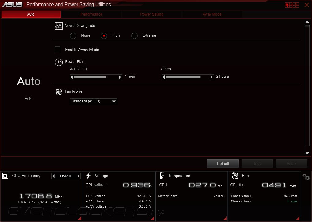 Программный модуль DIGI+ VRM служит для управления цифровой подсистемой питания, а подпрограмма TurboV EVO предназначена для настройки уровня продуктивности, регулировок напряжений, форсирования режима работы встроенной видеокарты, а также активации функции автоматического разгона. В нижней части интерфейса находится информационная панель, на которую выводится текущий режим быстродействия центрального процессора и показания датчиков аппаратного мониторинга.