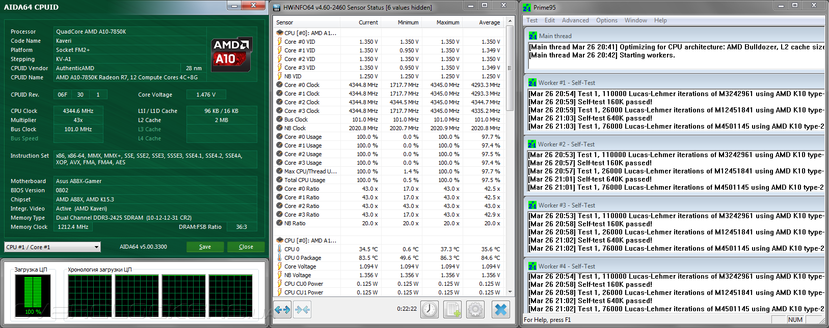 Оценка разгонного потенциала материнской платы проходила c применением гибридного процессора AMD A10-7850K, а для отвода тепла использовался один из лучших воздушных кулеров — Noctua NH-D15. В таких условиях новинка обеспечила стабильную работу нашего APU на частоте 4343 МГц, для достижения которой опорная частота была увеличена до 101 МГц, а коэффициент умножения вычислительных модулей равнялся 43. Увеличение частоты потребовало повышения напряжения CPU Offset Voltage на 0,1 В, тогда как параметр CPU Load Line Calibration принимал значение 80%. Встроенный северный мост работал на частоте 2020 МГц, во избежание ошибок в работе к напряжению VDDNB Offset Voltage также было добавлено 0,1 В, а модули памяти функционировали на частоте 2425 МГц с таймингами 10-12-12-31-2Т. С такими параметрами система проходила длительный тест в программе Prime95 в режиме In-place large FFTs, причем, мощному кулеру удалось удержать температуру гибридного процессора в пределах 86° С.