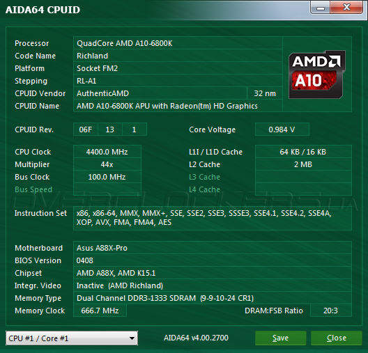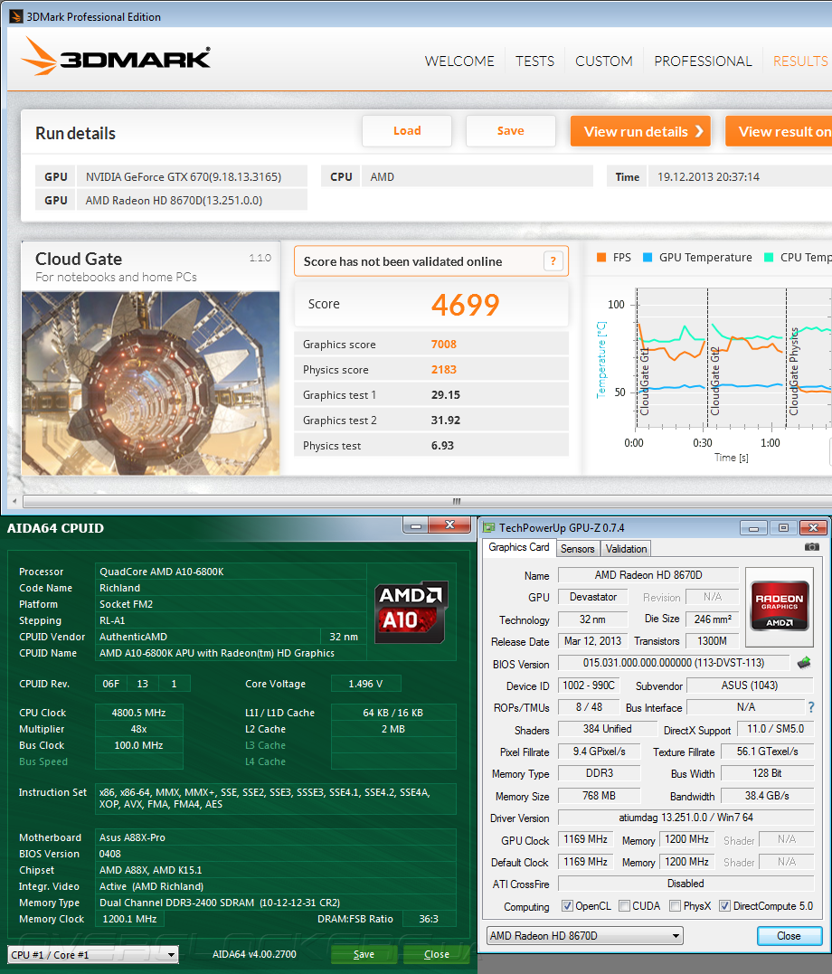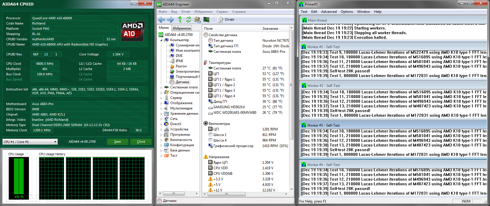 Наше недавнее тестирование APU Richland показало, что эти AMD A-Series имеют неплохой разгонный потенциал. C помощью системной платы ASUS A88X-Pro нам удалось поднять частоту A10-6800K до впечатляющих 4800 МГц путем простого повышения множителя! Для этого потребовалось увеличить напряжение на вычислительных модулях до 1,5 В, а также установить функцию CPU Load Line Calibration в значение High. При этом модули ОЗУ работали в режим 2400 МГц с таймингами 10-12-12-31-2Т при напряжении 1,65 В, а встроенный северный мост функционировал на частоте 2400 МГц, для чего VDDNB Voltage было увеличено до 1,35 В. Заметим, что в разгоне технологии энергосбережения продолжили свою работу, снижая энергопотребление системы в моменты простоя.