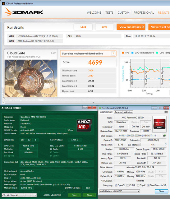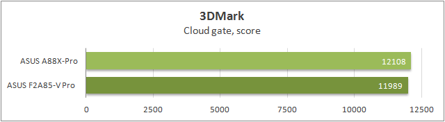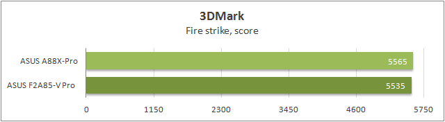Результаты в игровом бенчмарке Futuremark 3DMark вполне предсказуемы. Из-за пониженной частоты северного моста ASUS F2A85-V Pro продемонстрировала меньшее быстродействие.