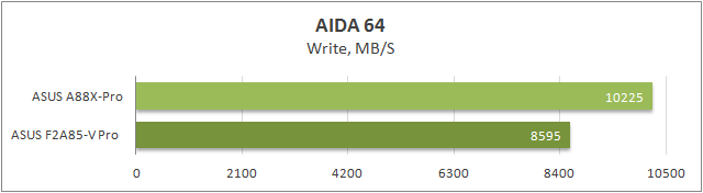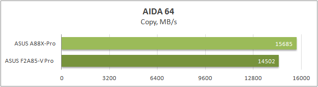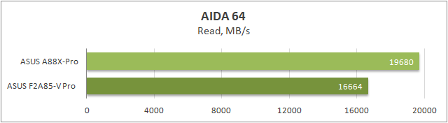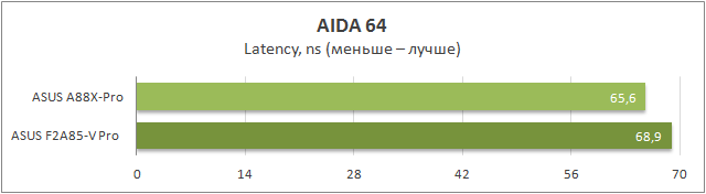 В синтетических тестах пропускной способности ОЗУ ASUS A88X-Pro заметно опередила модель предыдущего поколения. Оказалось, что в штатном режиме новинка установила частоту встроенного северного моста на уровне 1800 МГц, тогда как для ASUS F2A85-V Pro это значение составило 1500 МГц, что легко объясняет разницу в быстродействии.