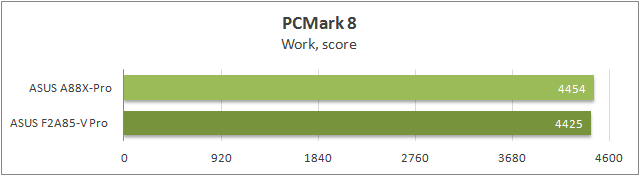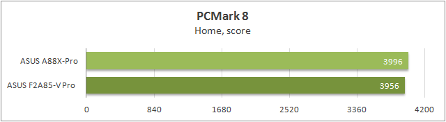 В комплексном тестовом приложении Futuremark PCMark 8, который показывает скорость выполнения типичных прикладных задач, разница между конкурсантками так невелика, что мизерное преимущество ASUS A88X-Pro можно не брать во внимание.