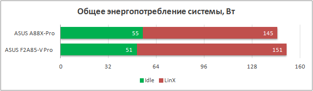 В простое лучшую энергоэффективность показала системная плата ASUS F2A85-V Pro, тогда как при максимальной нагрузке более экономичной оказалась ASUS A88X-Pro. Ввиду схожести конструкций силовых подсистем конкурсанток разницу в энергопотреблении можно объяснить различными настройками в прошивках, так что обновление управляющего микрокода, наверняка, улучшит показатели экономичности новинки при отсутствии вычислительной нагрузки.