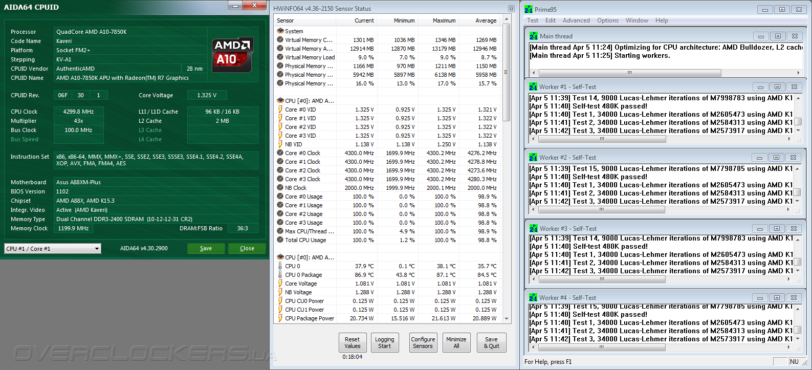 Поскольку ASUS A88XM-Plus является недорогой моделью — было бы наивным ожидать от неё выдающихся результатов разгона. На практике для нашего гибридного процессора AMD A10-7850K удалось достичь стабильности лишь на частоте 4300 МГц, тогда как малейшее её превышение приводило к зависанию системы. Для получения такого разгона напряжение на вычислительных ядрах и встроенном северном мосте повышалось на 0,075 В, а опции Load Line Calibration устанавливались в значение High. Модули ОЗУ функционировали на частоте 2400 МГц с задержками 10-12-12-31-1Т в соответствии с профилем X.M.P.
