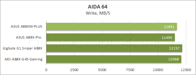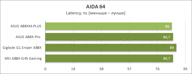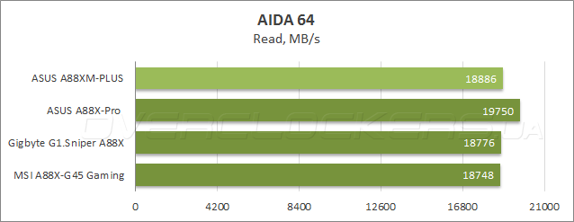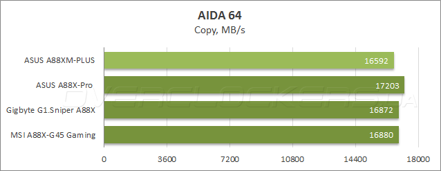 В Cache & Memory benchmark в тесте чтения новинка заняла второе место, уступив лишь ASUS A88X-Pro, а также показала наименьшую среди всех участниц латентность. В то же время, при записи и копировании данных в ОЗУ героиня сегодняшнего обзора уступила системным платам Gigabyte и MSI.