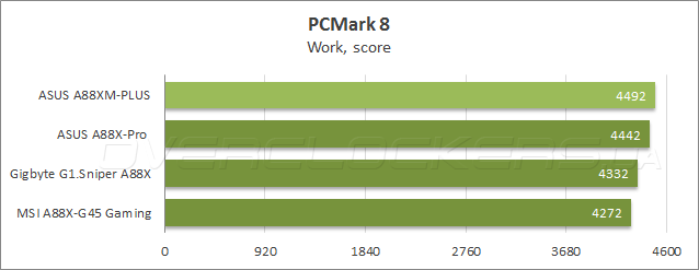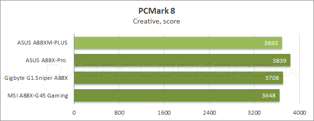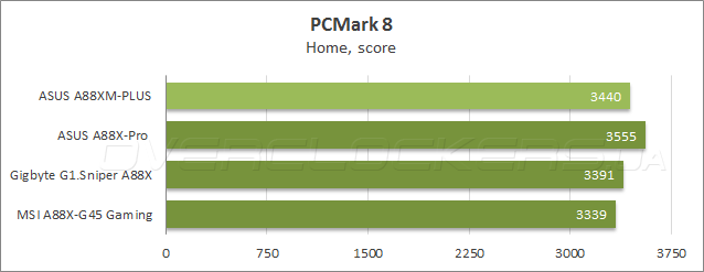 Результаты в тестовом приложении Futuremark PCMark 8 показывает уровень быстродействия при выполнении повседневных прикладных задач. В сценарии домашнего использования у ASUS A88XM-Plus второй результат, при создании цифрового контента плата немного отстала от своей старшей сестры, тогда как в подтесте, имитирующем работу в офисных приложениях, новинка заслужила победу.