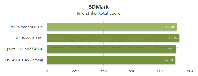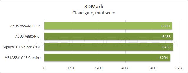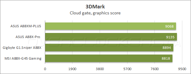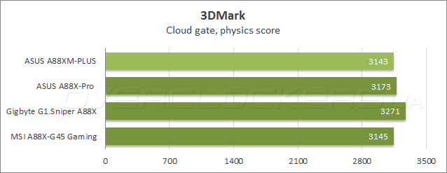 Прежде чем приступить к тестированию в играх, была проведена оценка производительности в графическом бенчмарке Futuremark 3DMark. В тестовом сценарии Cloud gate ASUS A88XM-Plus показала отличные результаты в общем зачете и графическом подтесте, тогда как в физических расчетах лучшей оказалась системная плата Gigabyte, а новинка разделила третье место с «материнкой» MSI A88X-G45 Gaming.