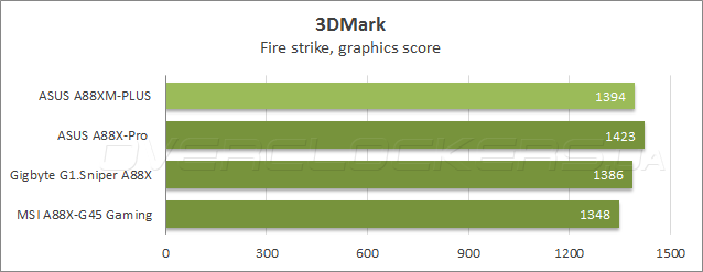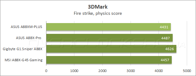 Подтест Fire strike из состава Futuremark 3DMark поставил героиню сегодняшнего обзора на вторую ступень пьедестала благодаря отличному быстродействию встроенной видеокарты, тогда как при расчете физических эффектов A88XM-Plus снова показала один из худших результатов.