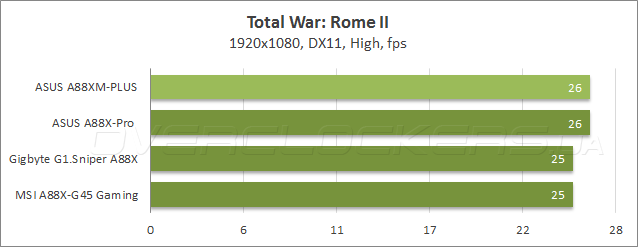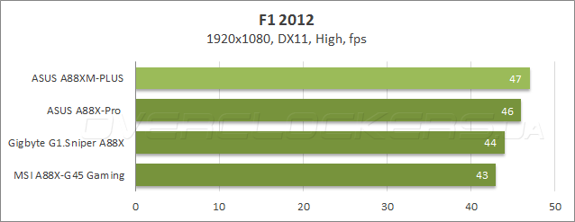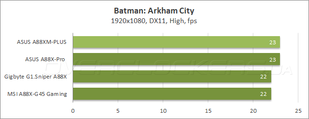 Тестирование в компьютерных играх проводилось в разрешении Full HD при высоких, но не максимальных настройках качества. В таком режиме ASUS A88XM-Plus обеспечила высокую производительность, так что неудачное выступление в полусинтетическом 3DMark можно списать на неоптимальную версию прошивки.