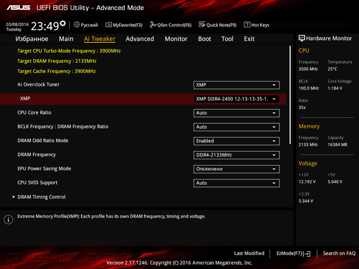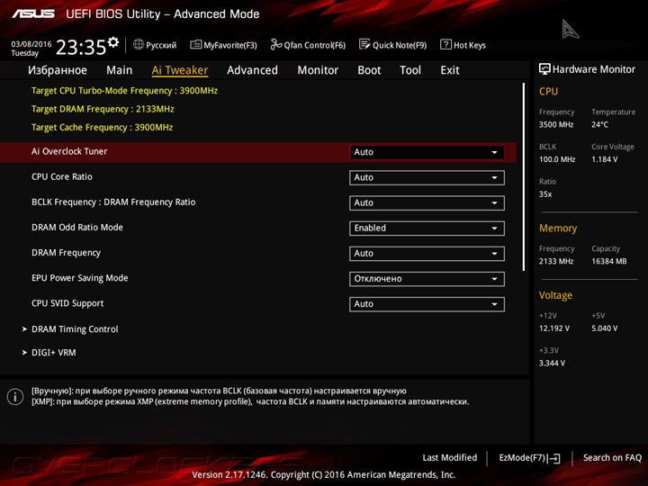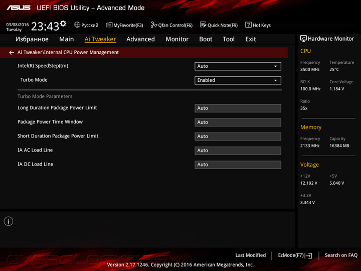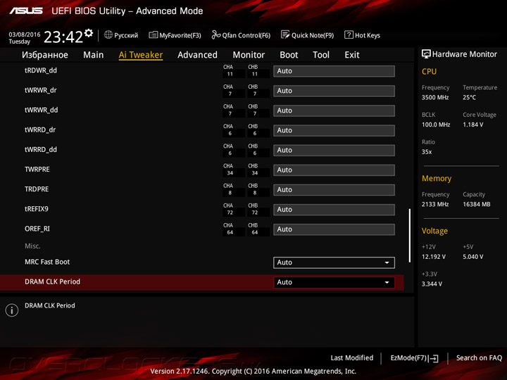 Раздел AI Tweaker, честно говоря, выглядит лёгкой насмешкой. Несмотря на наличие всех необходимых для разгона настроек, значения их ограничены стоковыми и их можно только понизить. Настройки памяти, а именно непосредственно числа вплоть до 4266 МГц, стали для меня загадкой, так как системная логика B150 не поддерживает рабочую частоту памяти выше 2133 МГц и выбор как X.M.P. профиля с частотой 2400 МГц, так и ручное управление этим параметром приводило к зависанию во время загрузки и сбросу настроек в дефолт. Зато пользователю доступен широчайший выбор и управление таймингами памяти.