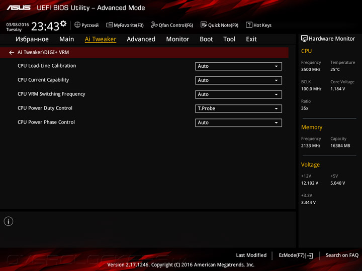 Подзакладка DIGI+ VRM необходима для настройки цифровой подсистемы питания. Функция Load-line Calibration здесь широко представлена, как и в старших решениях, хотя необходимость в ней опять же сомнительна. Раздел Internal CPU Power Management содержит в себе управление технологиями Intel Turbo Boost и EIST.