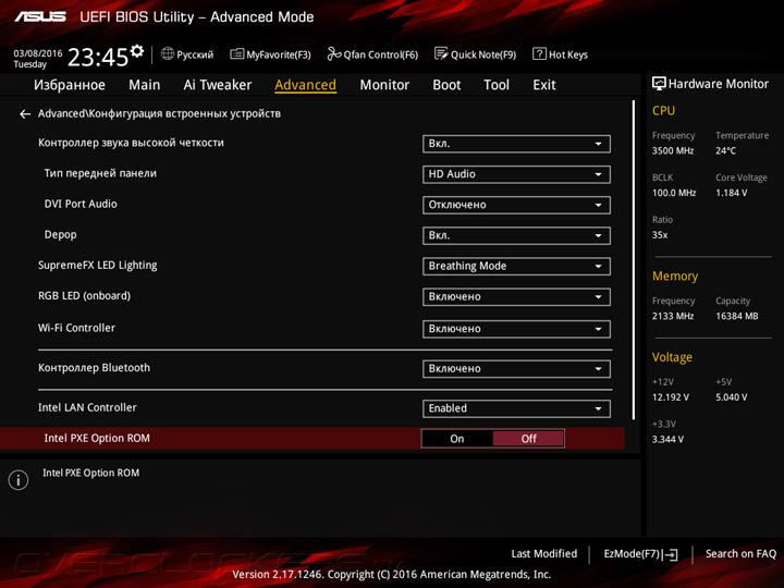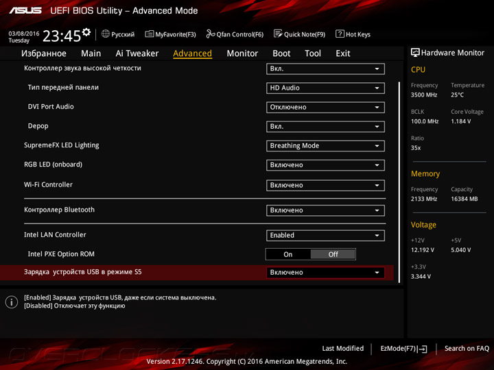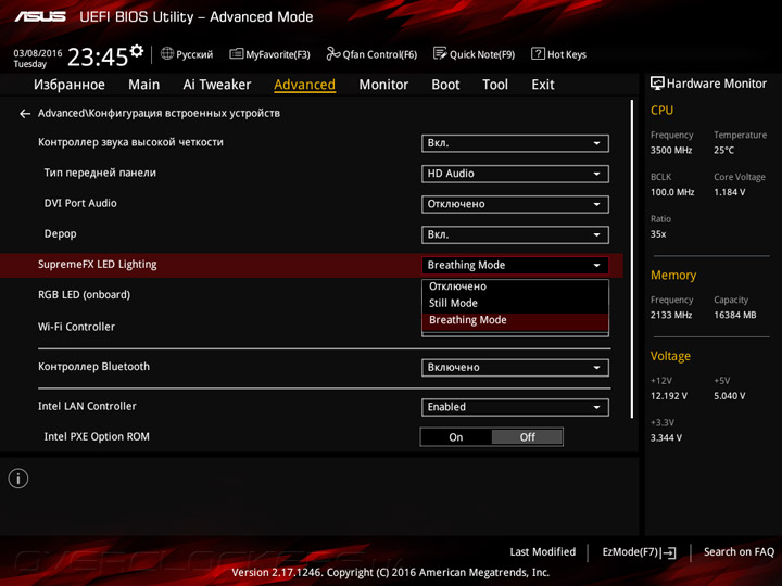 Раздел Advanced отвечает за управление периферийными устройствами. Тут можно получить общую информацию о процессоре, подключенных накопителях, сетевых интерфейсах, а также контролировать подсветку зоны звукового тракта и диодов «Ауры».