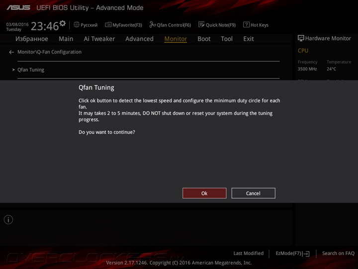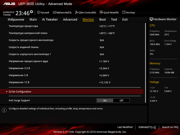 В разделе Monitor получаем доступ к показателям температур, входящих от блока питания напряжений и оборотов вентиляторов. Тут же находится многим известная и очень удобная, благодаря возможностям тонкой настройки, утилита Q-Fan. Последняя не только позволит настроить кривые активности вентиляторов, но даже в автоматическом режиме определит диапазон их рабочих оборотов.
