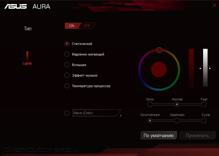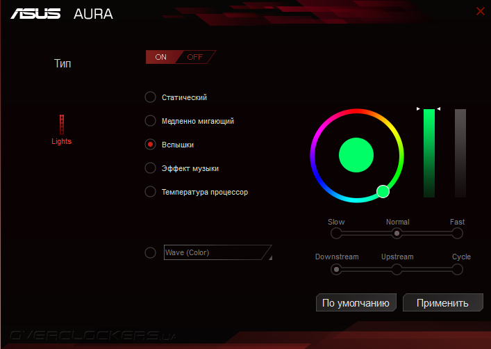 В первую очередь — это конечно утилита, позволяющая контролировать RGB-подсветку материнской платы. Утилита контроля получила нехитрое название ASUS Aura и полный набор всевозможных настроек. Доступны следующие режимы: статический, медленно мигающий, вспышки, эффект музыки, температура процессора. При этом внутри каждого из режимов можно настроить переходы цветов, их направления, скорость и т.д. Интересен режим с привязкой к температуре процессора, в котором пользователь может настроить три цвета, соответствующие температурным режимам в пределах от 20 до 40 градусов, от 40 до 60, от 60 и выше.
