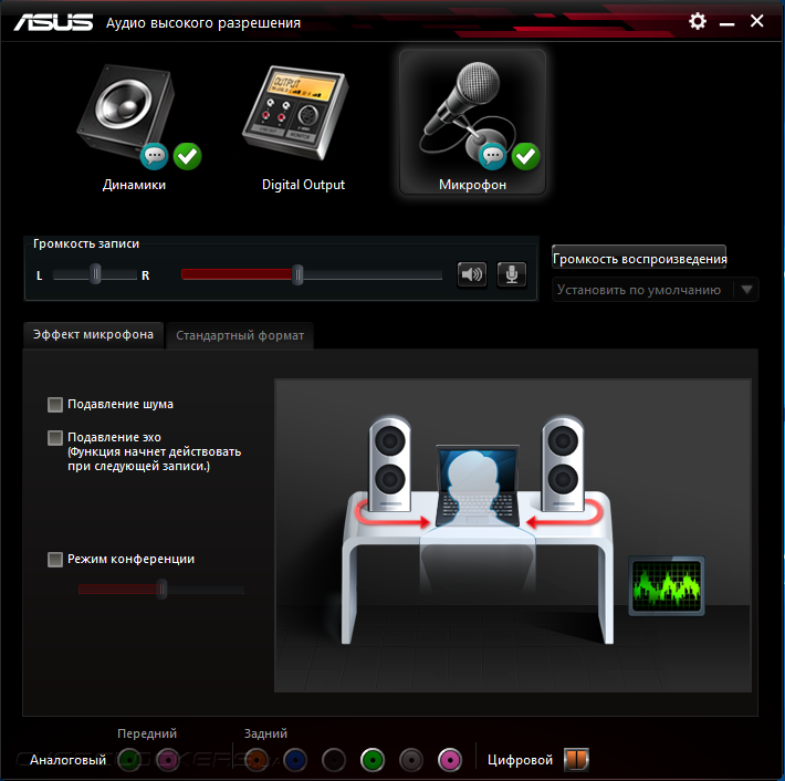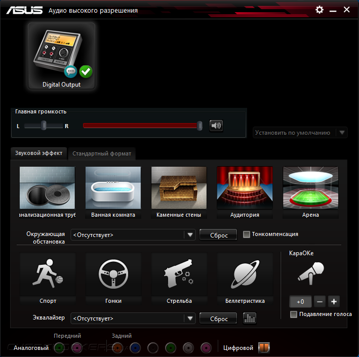 Утилита, сопровождающая аудиокодек мне понравилась. В ней пользователь сможет получить доступ как к управлению своей аппаратной частью, так и к всевозможным звуковым эффектам. Хотелось бы, правда, чтобы компания приблизилась к внешнему виду и функциональности комплектного ПО звуковых карт серии Strix — в нём удалось собрать весь спектр настроек без создания множества закладок.
