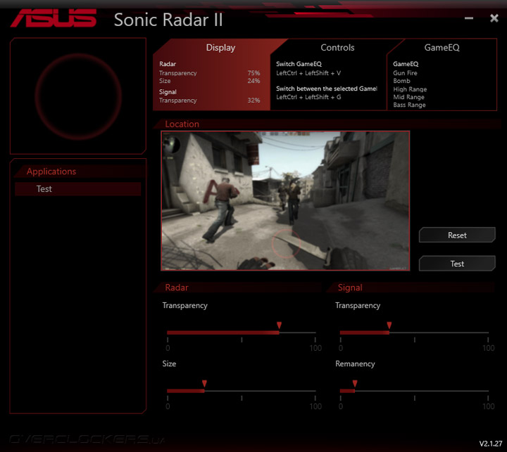 Также с платой поставляется приложение ASUS Sonic Radar II, позволяющее включить поверх игры схематичное изображение радара, указывающего направление и расстояние до источников звука. ПО позволяет настроить внешний вид «радара», прозрачность элементов и месторасположение на экране. Насколько полезной она может оказаться — каждый сможет решить для себя сам.