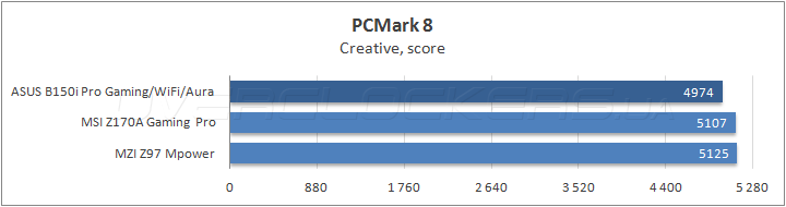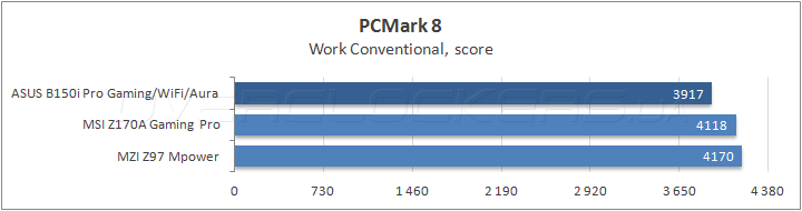 PCMark имитирует реальную рабочую нагрузку на систему и тут мы видим, что разница между решениями B150 и Z170 составляет буквально несколько процентов.