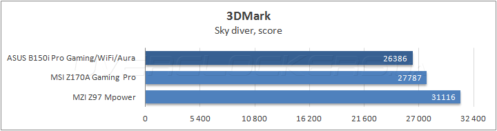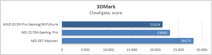 А вот 3DMark продемонстрировал интересные результаты. B150i Pro Gaming/Wi-Fi/Aura близка к конкуренту на Z170 и немного проигрывает из-за той самой разницы в 100 МГц частоты процессора. Но в бенчмарках Cloud Gate и Sky Diver, которые меньше чем Fire Strike упираются в производительность видеокарты система на Z97 вырывается далеко вперед, видимо благодаря дополнительным четырем потокам в Core i7-4790K.