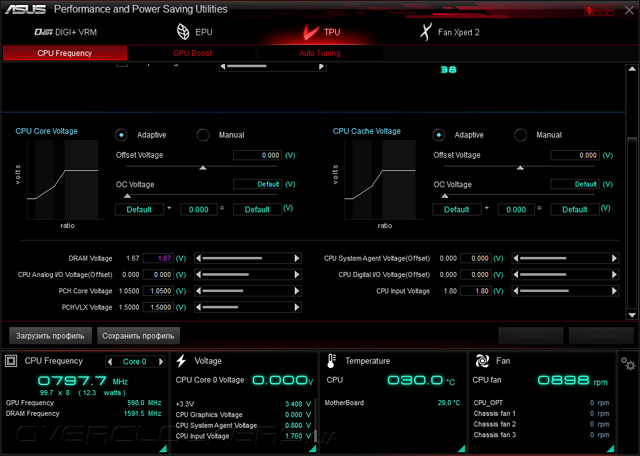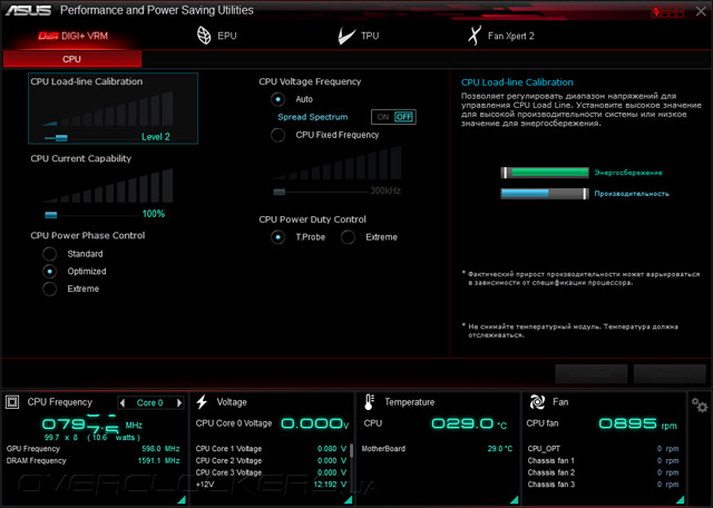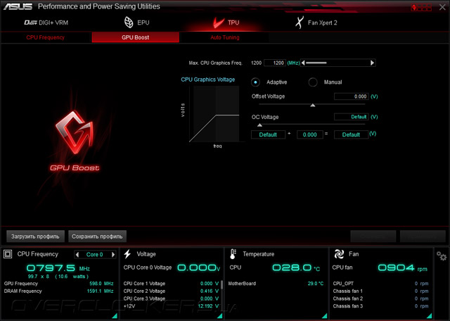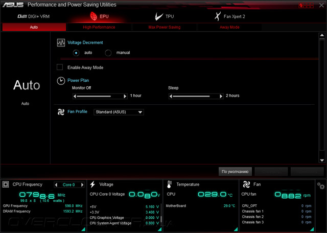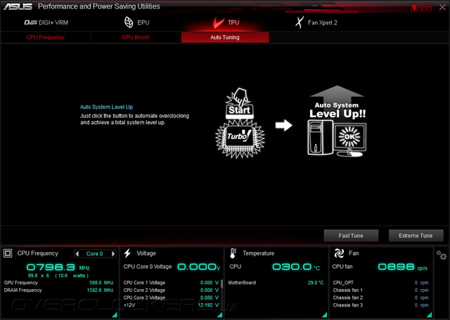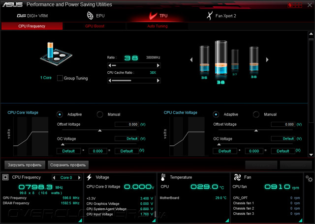 Все утилиты, приготовленные для тонкой настройки системы, не оснащены каким-либо мастером-проводником по настройкам, как это происходит с более старшими платами и комплексом Dual Intelligent Processors. Всё называется скромно — Performance and Power Saving Utilities. Ничего необычного в этой среде нет, частично здесь можно выяснить что именно скрывается за полями Auto в среде UEFI. Интересно выглядит возможность Auto Tuning, обещающая автоматическое увеличение быстродействия. Опробуем её в следующей части обзора.