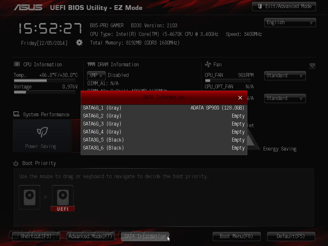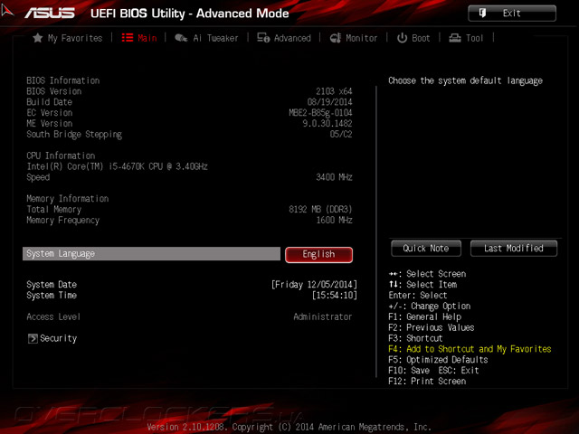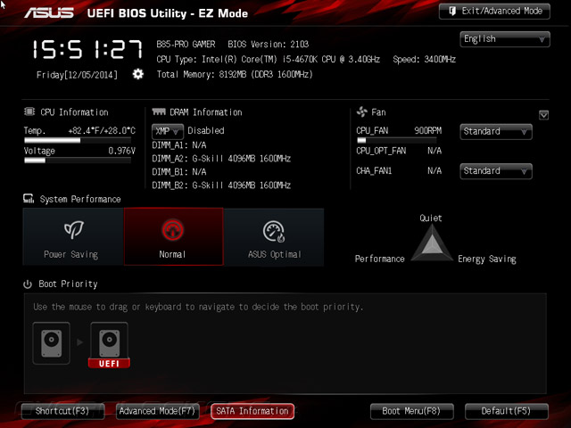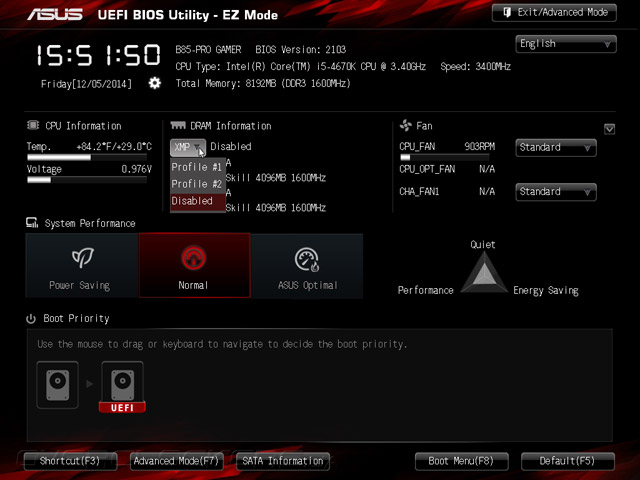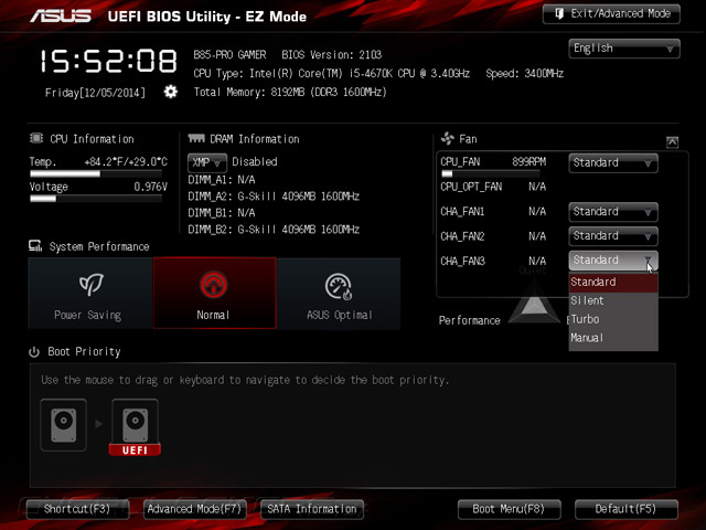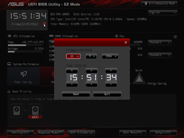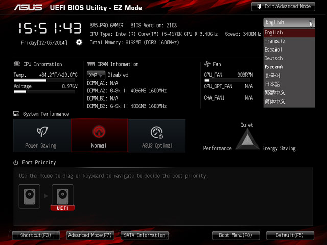 Для меня было удивительным обнаружить стиль оформления меню, свойственный продуктам прошлого поколения, учитывая сравнительно недавний выход на рынок рассматриваемой модели. Но главное — это имеющиеся возможности. В упрощённом меню настроек можно получить базовые сведения об установленных компонентах и режимах их работы, а кроме того: установить время и календарь, выбрать язык отображения интерфейса, форсировать XMP для DRAM, определиться с режимом функционирования системных охладителей и приоритетом загрузочных устройств, просмотреть краткие сведения о подключенных накопителях. Для быстрой настройки этого целиком достаточно. Отмечу применённую здесь модель цветового оформления, лаконично подходящую к общему стилю подачи B85-Pro Gamer.
