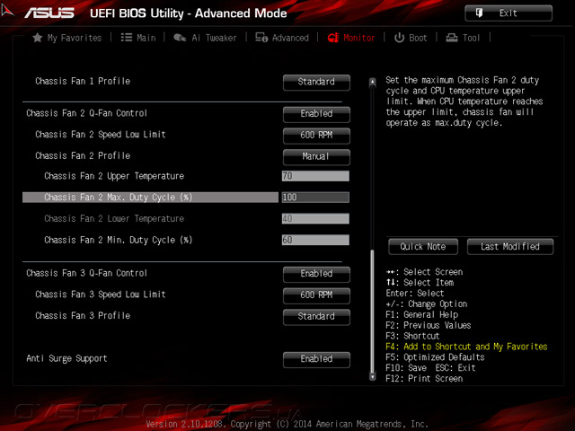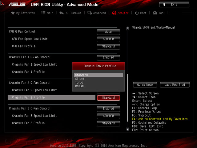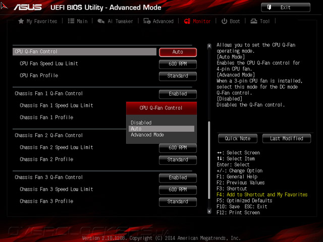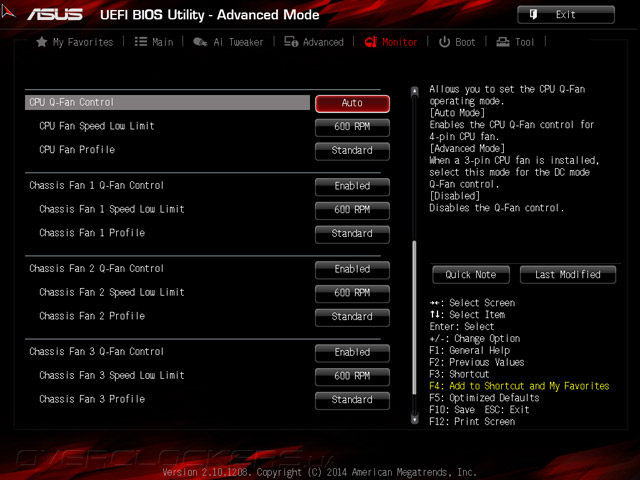На странице Monitor кроме отображения самых важных действующих напряжений и температуры платы с ЦП находится инструментарий по настройке функционирования системных охладителей. Есть три готовых профиля, а также возможность ручного изменения алгоритма функционирования охладителей. Однако всё это не идёт ни в какое сравнение с возможностями фирменного ПО. Примечательно, лишь для охладителя ЦП можно вручную выбрать его тип — четырёхконтактное или трёхконтактное исполнение.