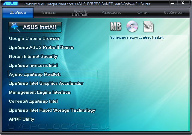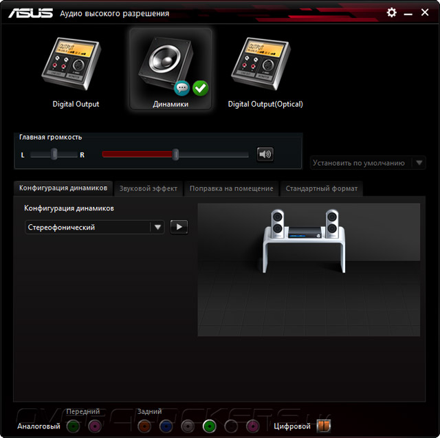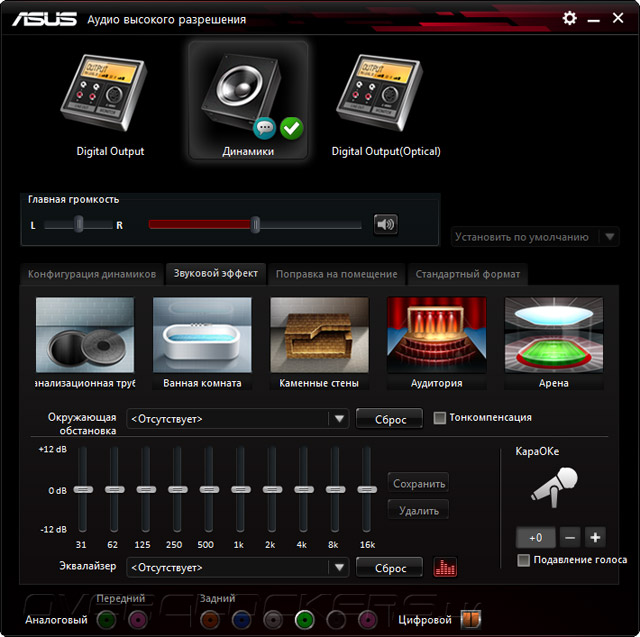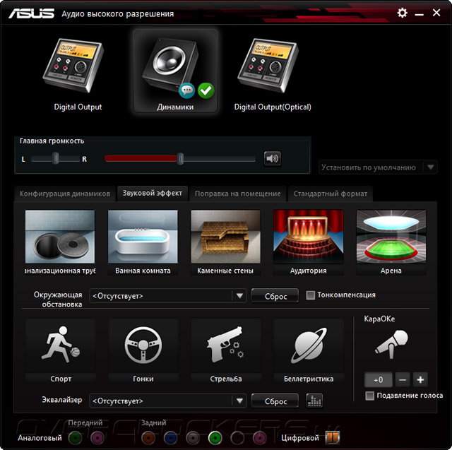 Несмотря на упомянутую реализацию Sonic Radar как на официальной странице модели в Сети, так и на её упаковке, в действительности на диске найти такую утилиту не удалось. Более того, не доступна она и на всё той же официальной странице поддержки. Поэтому довольствоваться придётся только фирменным конфигуратором звукового устройства от Realtek.
