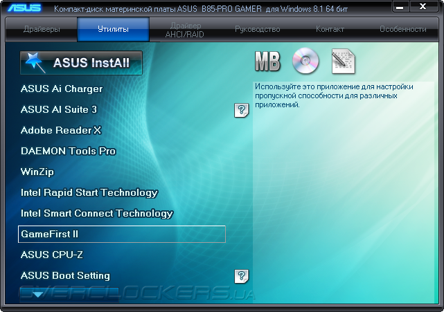 В обзоре ASUS Maximus VII Gene рассматривалась более свежая версия утилиты GameFirst, там она приобрела индекс с цифрой три, в комплексе с B85-Pro Gamer предоставлена более древняя, вторая версия. Нет ничего удивительного в обнаруженных её корнях от разработчиков cFos Software, поскольку практически все решения, создающие конкуренцию Killer Network, базируются на cFosSpeed.