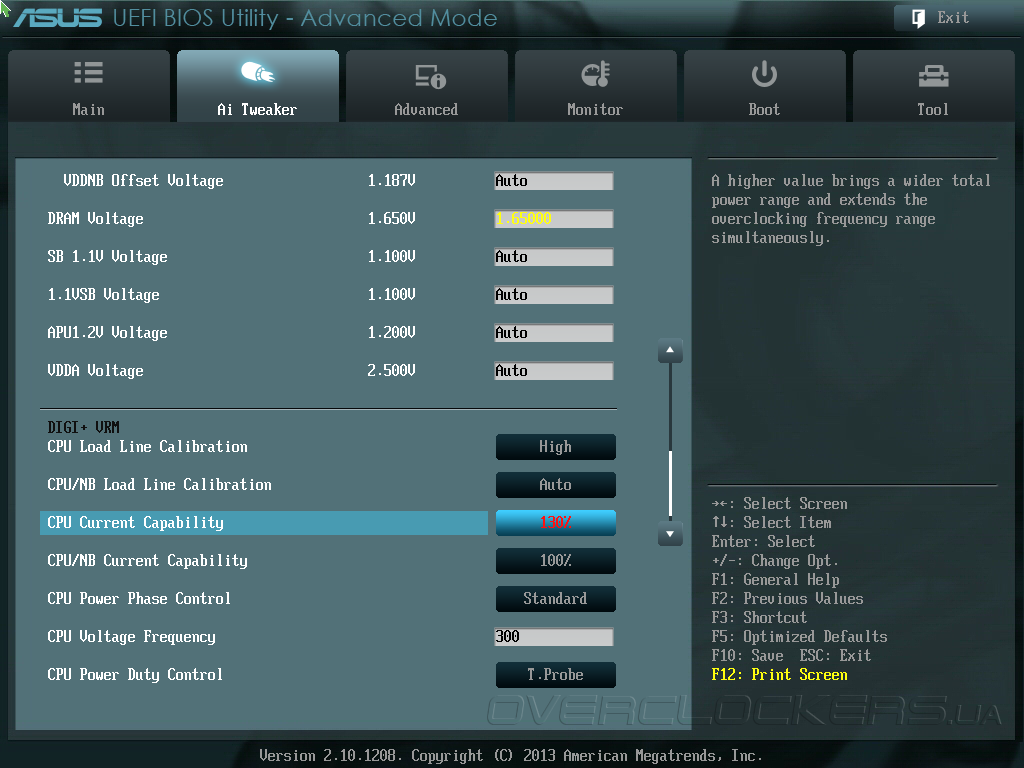 Разгон процессора затребовал больше времени. Наиболее лояльным из сценариев стабилизации напряжения стало значение High; при меньшем (Medium) наблюдались ошибки в Prime95 после 15–20 минут тестирования, профиль Extreme серьёзно завышал напряжение на ЦП. Для сохранения частоты в желаемых нами рамках также форсировалось 130% значение пункта CPU Current Capability, поскольку при штатных 100% вначале напряжение скачкообразно понижалось на 0,1, а затем на целых 0,2 В. В результате частота некоторых ядер также опускалась. Такие действия продолжались несколько секунд и всё возвращалось в норму. Возможно, именно такое поведение наблюдали остальные пользователи продукции ASUS при штатном режиме работы ЦП.