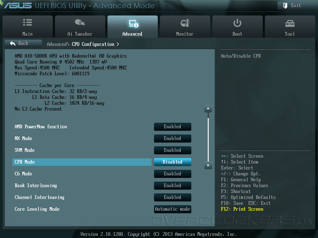 Отключение технологии Turbo Core обнаружилось в пункте меню CPU Configuration вкладки Advanced.