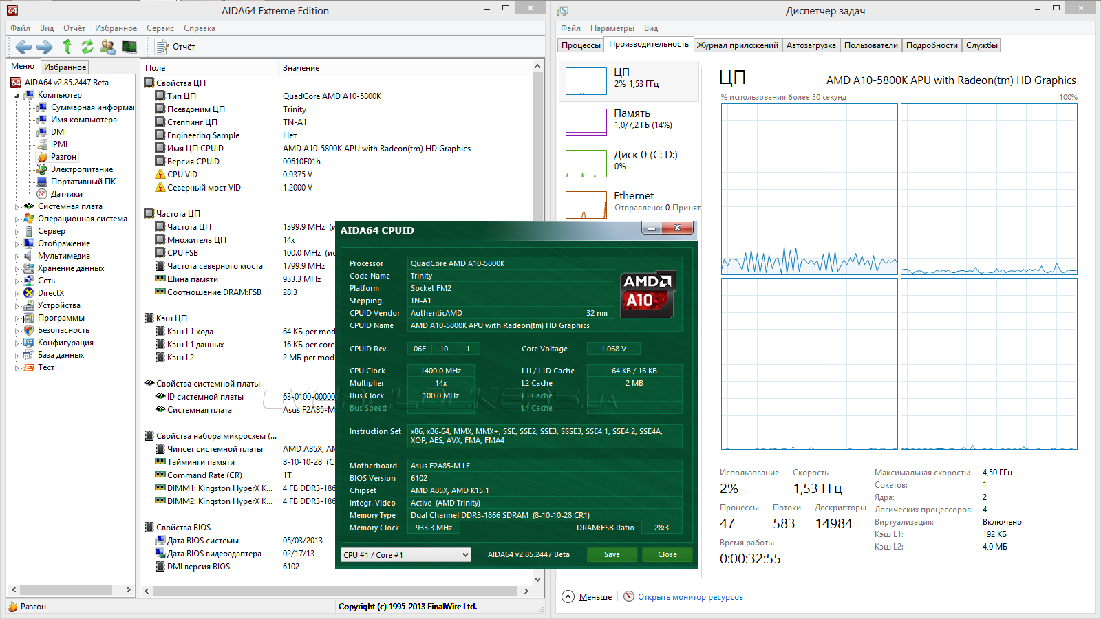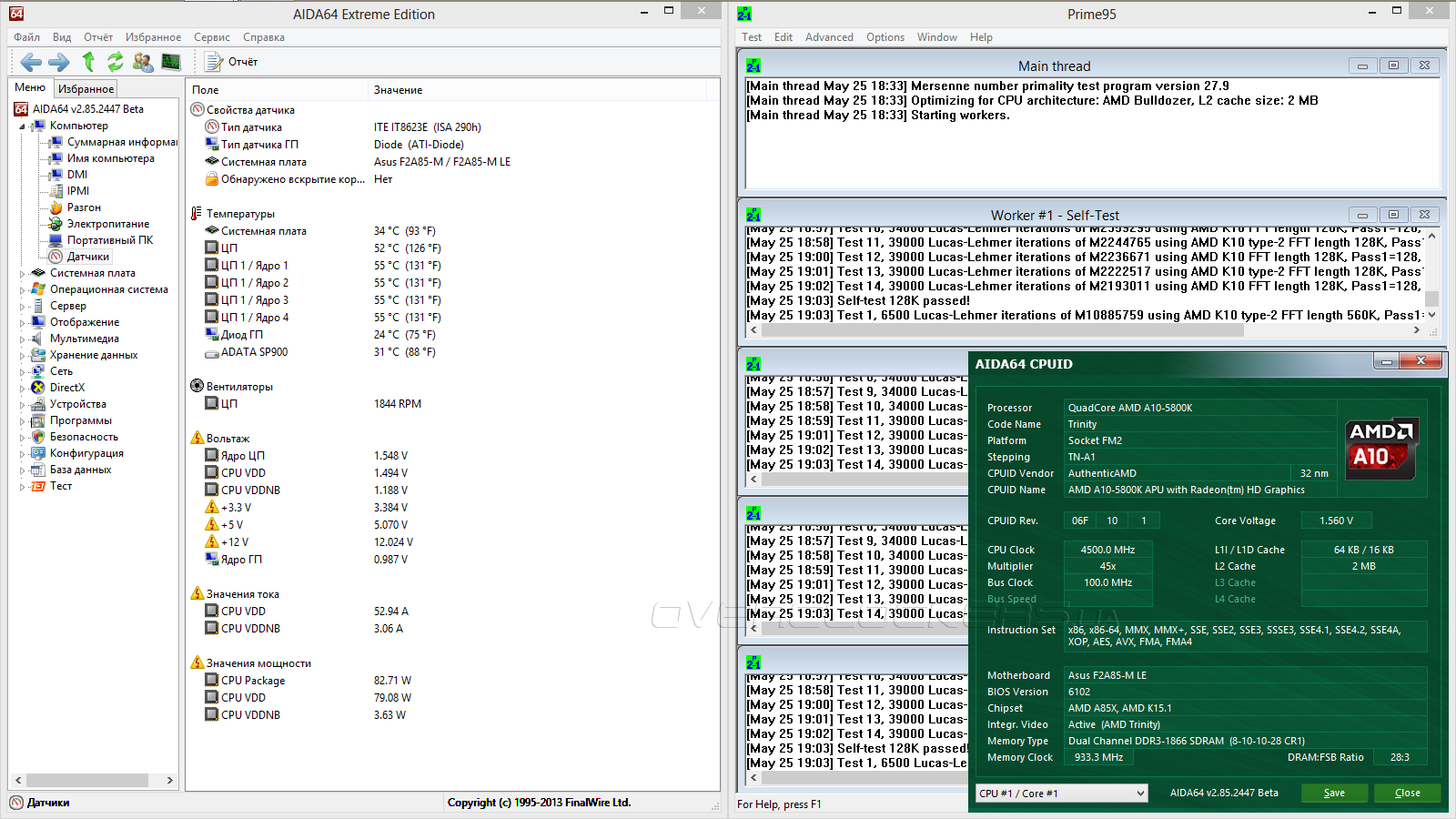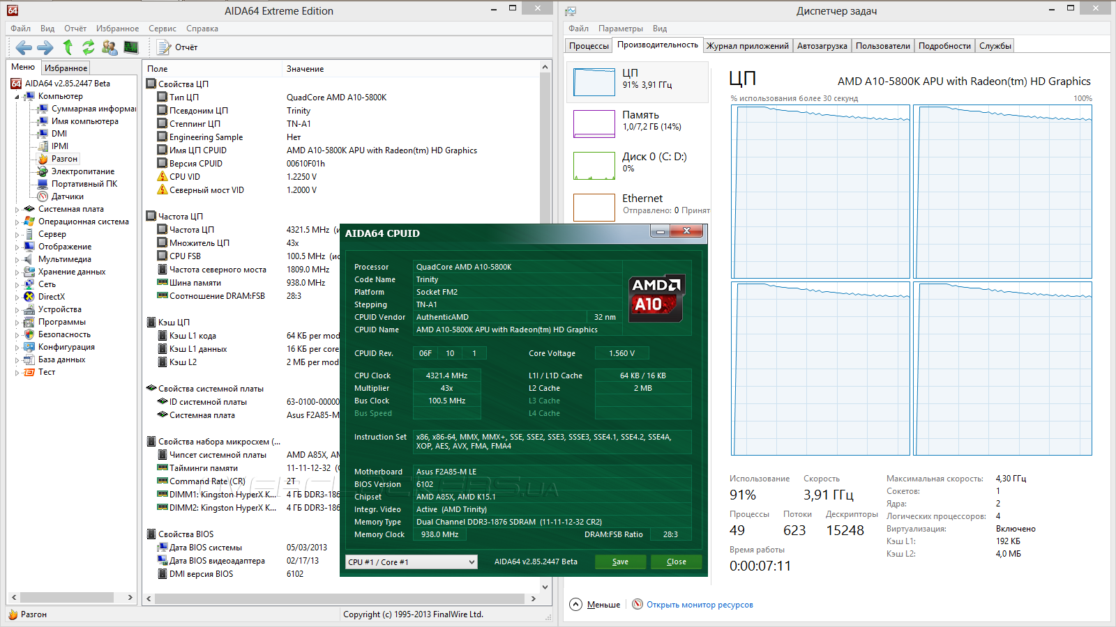 Напряжение питания довелось повысить до 1,525 В путём добавления 0,138 В к штатному значению. И всё же благодаря работе стабилизирующих технологий оно завышалось до 1,56 В в момент серьезной нагрузки. Такие мероприятия позволили заработать нашему APU на частоте 4500 МГц; функции энергосбережения продолжили свою работу — в простое понижалась как частота, так и напряжение.