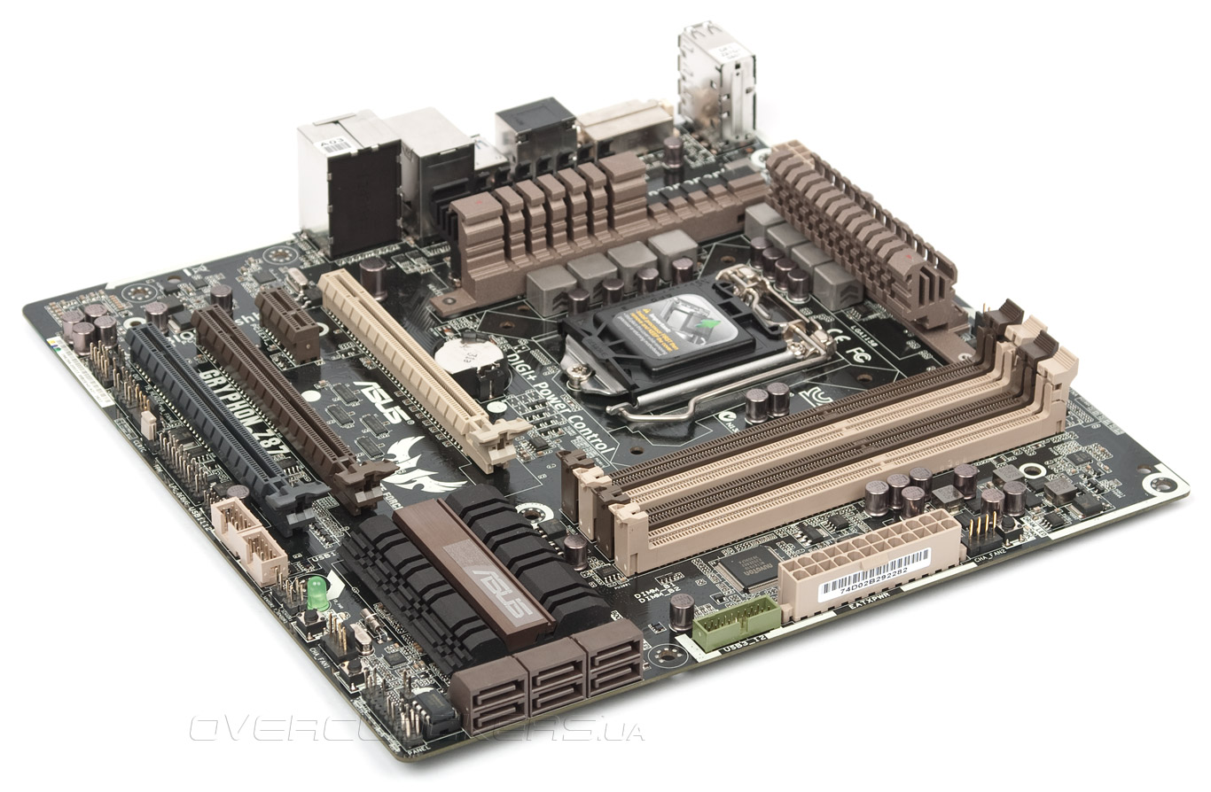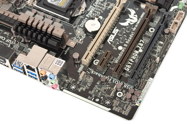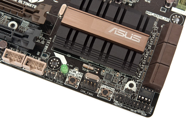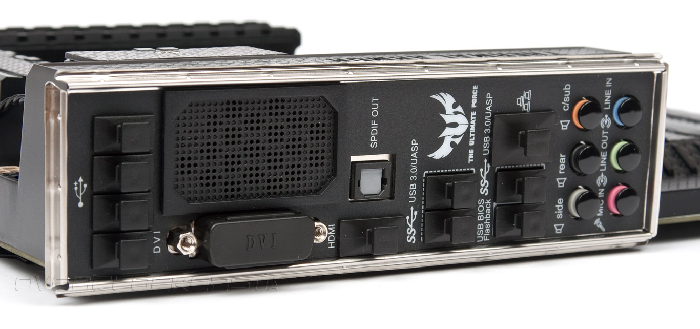 В один ряд — вдоль нижней грани — расположились всевозможные колодки для подключения периферии. Конфигурация слотов расширения достаточно классическая и для организации связки из двух видеокарт используются слоты, расположенные через один относительно друг друга.
