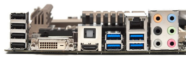 Наполненность задней панели минимальна, здесь нет ничего лишнего, все необходимые разъёмы для современной системы на месте и в должном количестве.