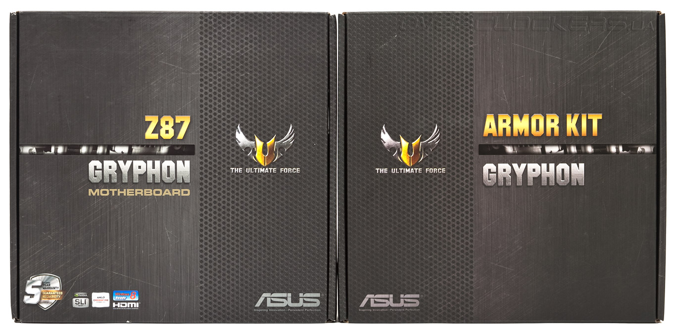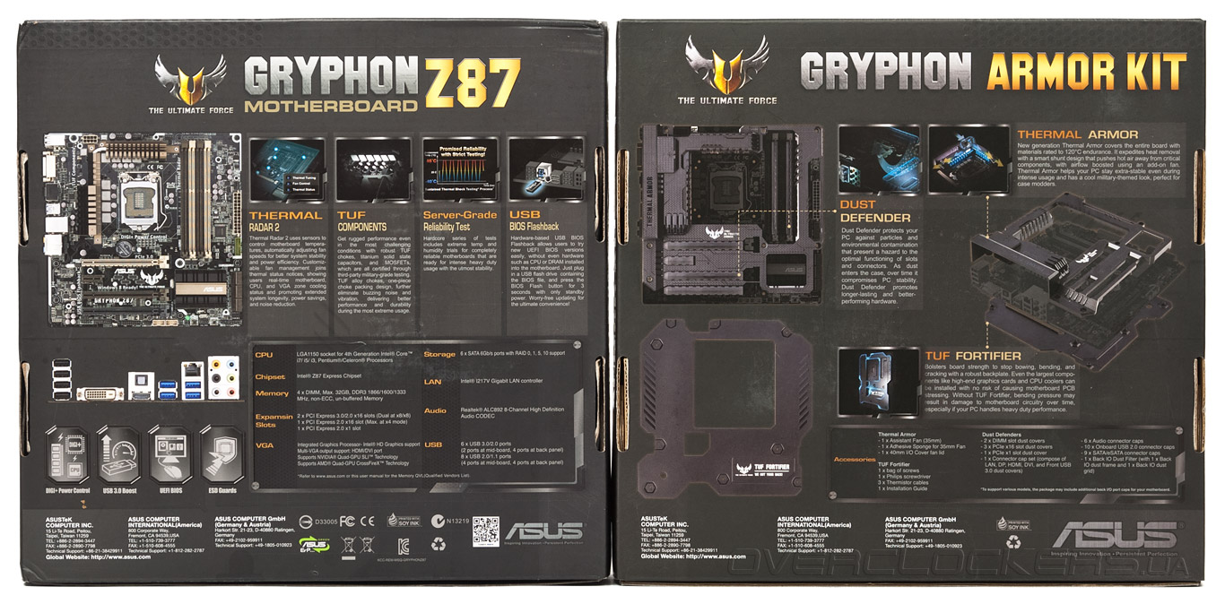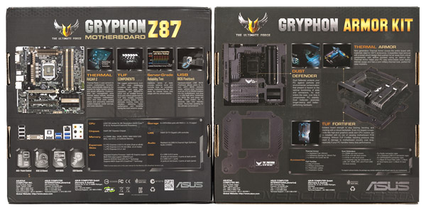 Обратная часть коробки от платы содержит её изображение, фото задней панели и таблицу с основными характеристиками, где точно указаны модели звукового и сетевого адаптеров. Рекламная информация раскрывает ту часть концепции The Ultimate Force, что реализована именно здесь. Недостающая часть разместилась на обратной стороне коробки от Armor Kit. Кроме фото не позабыли разместить весьма важную таблицу, где указан список всего того, что входит в комплект поставки.