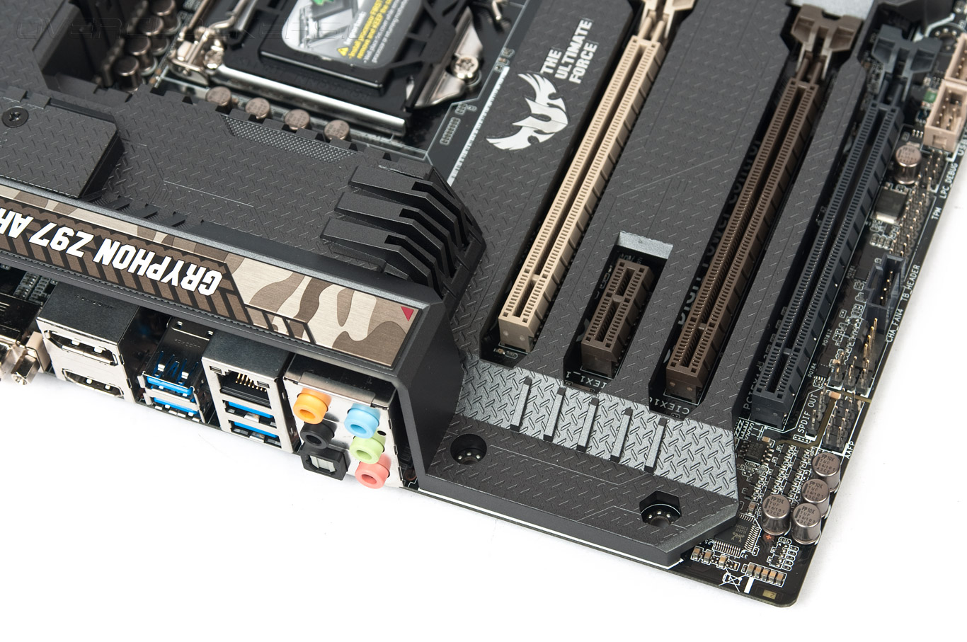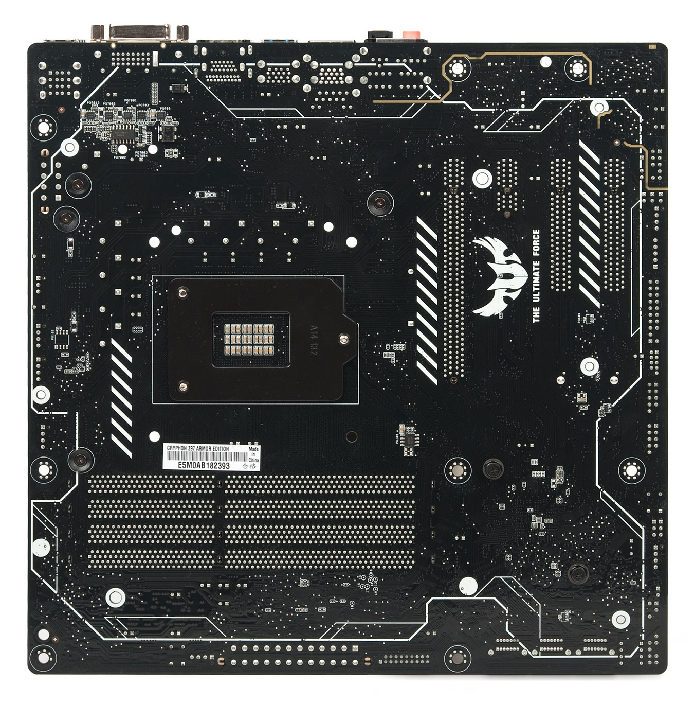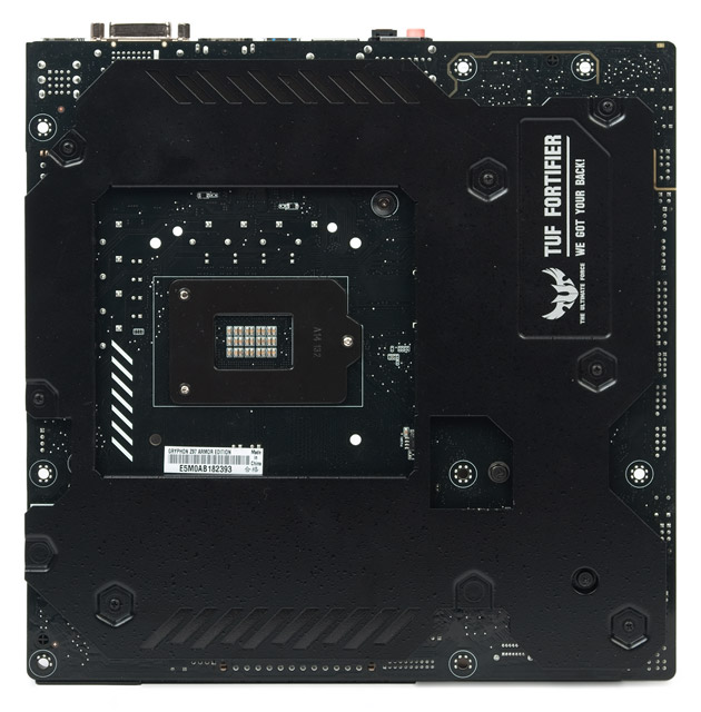 Обратная сторона усилена массивной металлической пластиной, толщина составляет не меньше миллиметра. Это, по заверениям разработчиков, позволяет уберечь плату от выгибания из-за высокой нагрузки разнообразными добавочными элементами — массивной СО для ЦП и/или габаритным видеоадаптером.