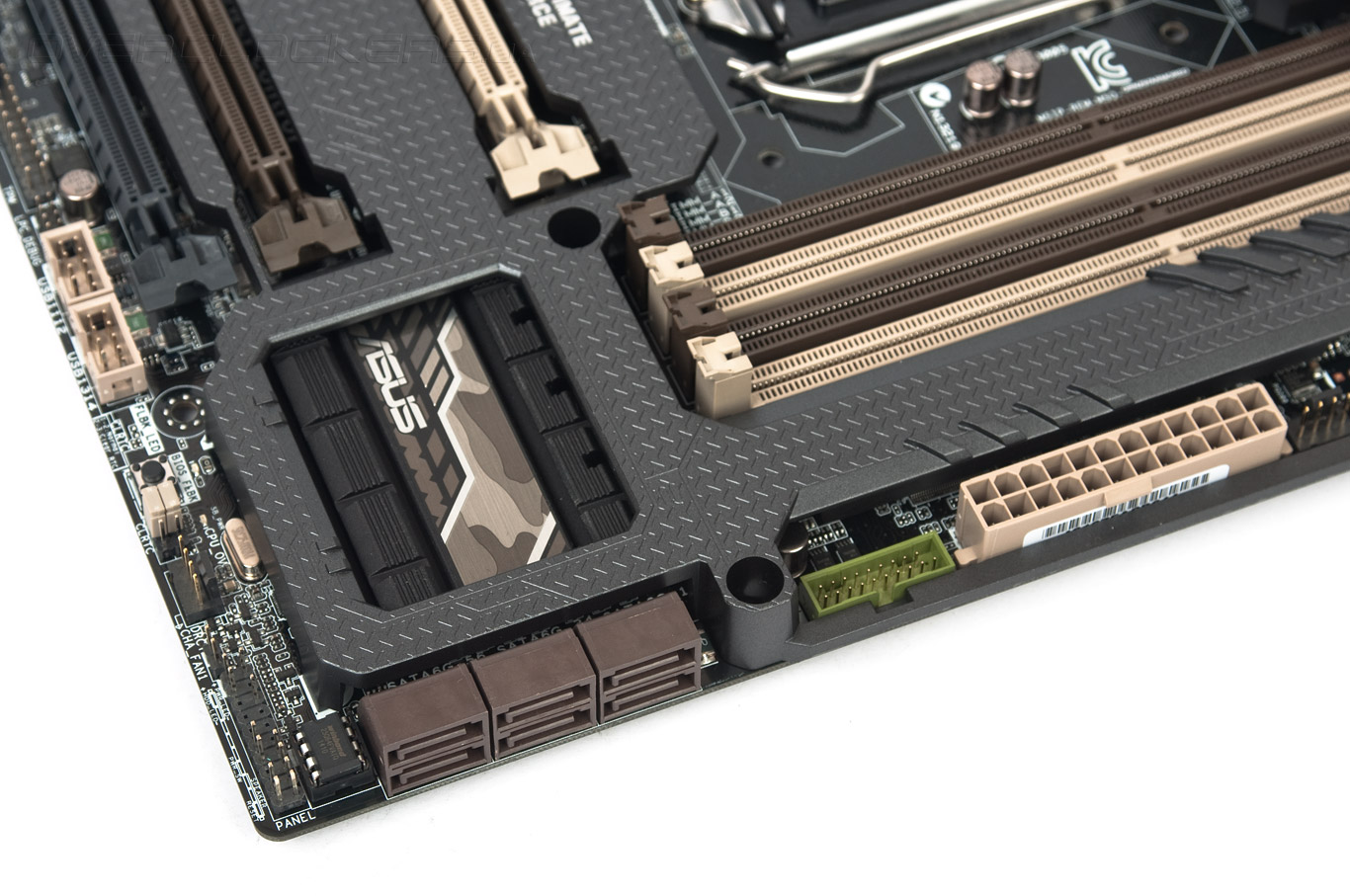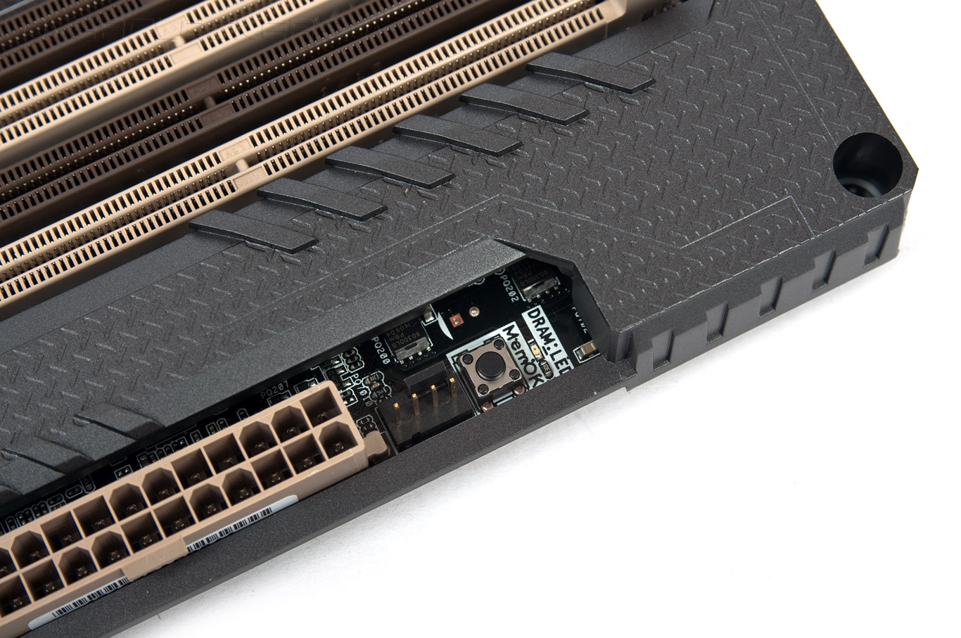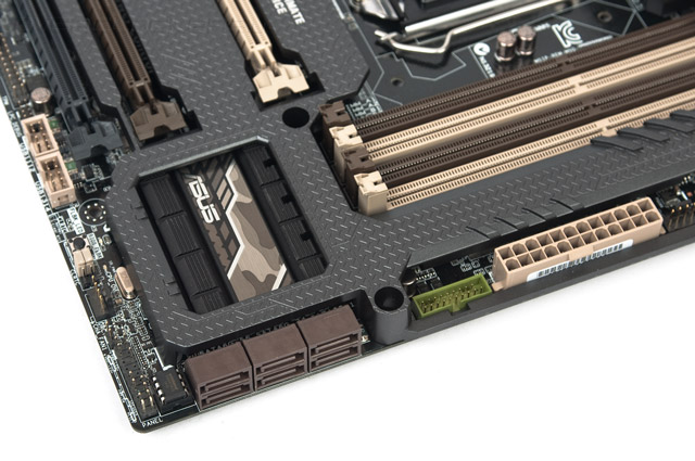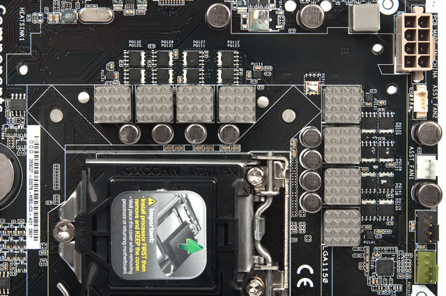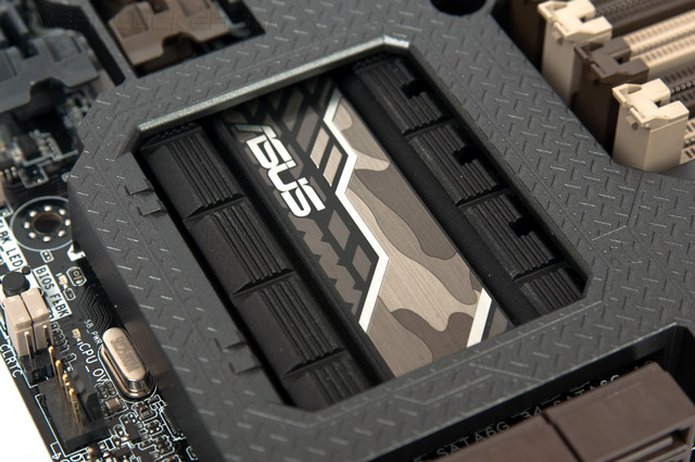 Для этой модели используется особая система охлаждения цепей питания преобразователя напряжения ЦП. Увеличено как само число рёбер, так и расстояние между ними, это позволит без труда проходить сквозь них потоку воздуха в случае использования нагнетающего вентилятора. Ещё хочется отметить присутствие на плате системы Q-LED — диагностических светодиодов, позволяющих определить на каком из компонентов происходит сбой инициализации оборудования, если такое событие будет иметь место. Свечение весьма яркое, и его без труда видно даже из-под верхней крышки Thermal Armor.