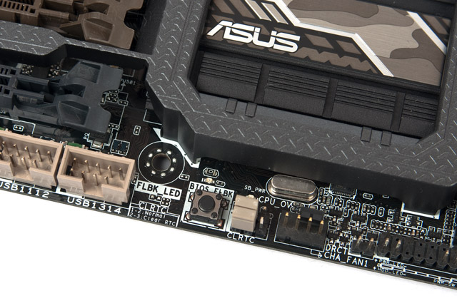 У нижней грани находится небольшая кнопка, ответственная за использование технологии USB BIOS Flashback. Для активации Direct Key распаяны всего два контакта; на мой взгляд, стоило бы поменять функциональность этих двух элементов между собой — не каждый день приходится прошивать UEFI. Для сброса настроек CMOS используется перемычка, а рядом с ней находится такая же, необходимая для активации CPU Overvoltage — тоже весьма необычное соседство.