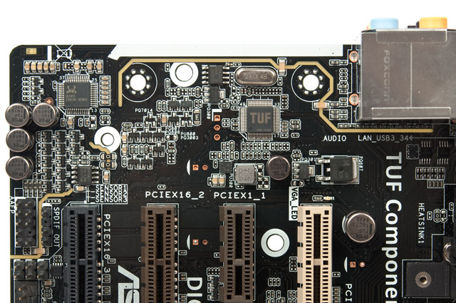 Расстояние между верхним слотом PCI-E и гнездом ЦП небольшое, но достаточное для обычного использования. Для особых видеокарт, оснащенных массивными усилительными пластинами, и случаев их одновременного использования с габаритной процессорной СО следует внимательно изучить вопрос взаимной совместимости. Между ним и третьим (коричневым) гнездом можно поровну поделить шестнадцать процессорных линий PCI-E, что позволит организовать тандем из двух видеокарт. Нижнее (чёрное) гнездо соотносится к PCH, максимальные его возможности — это использование лишь четырёх линий PCI-E.