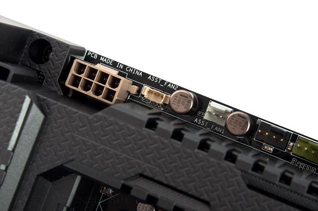 Группа колодок для нужд подключения охладителей процессора насчитывает два экземпляра, главный из них окрашен в оливковый оттенок. Вспомогательный вентилятор из комплекта Thermal Armor имеет специфическое гнездо, куда обыкновенный охладитель никак не подключить.