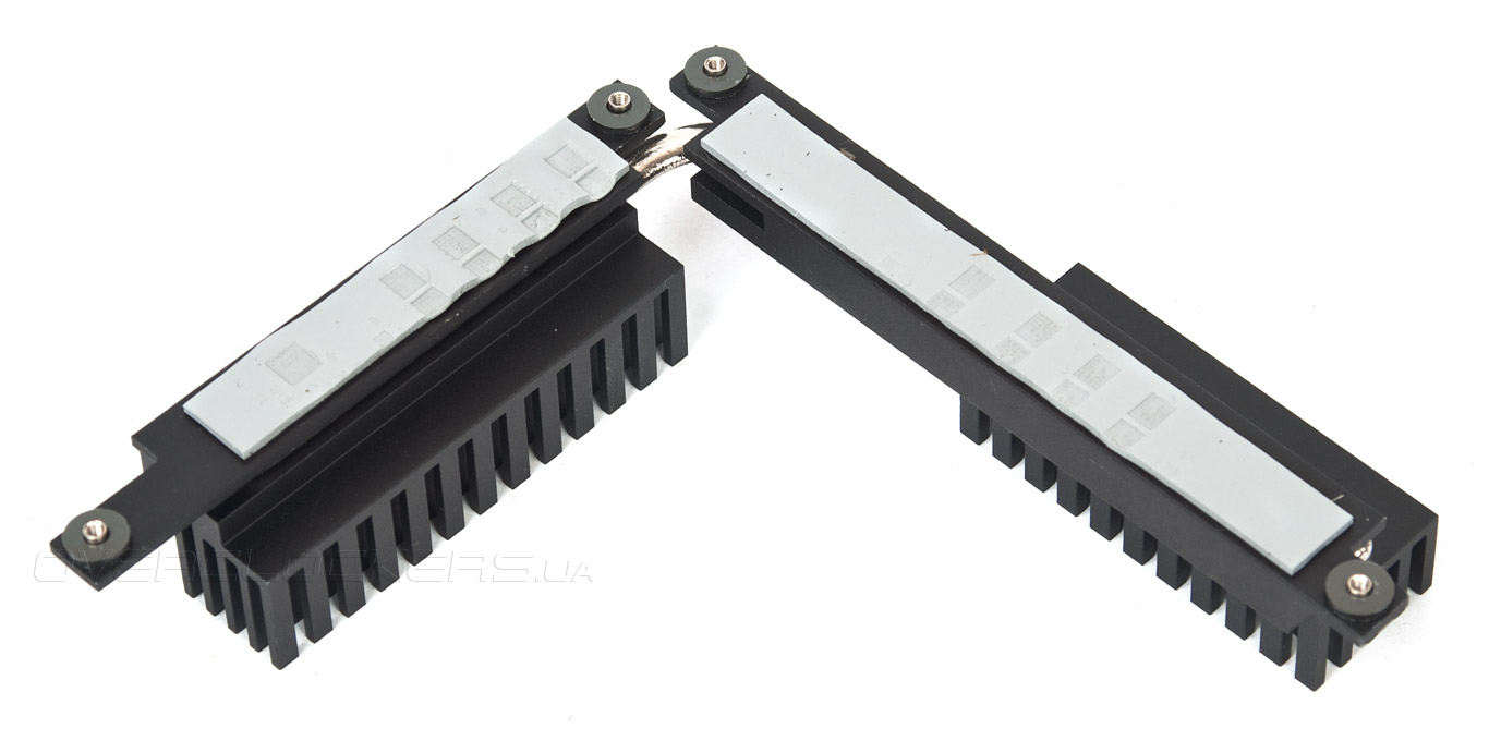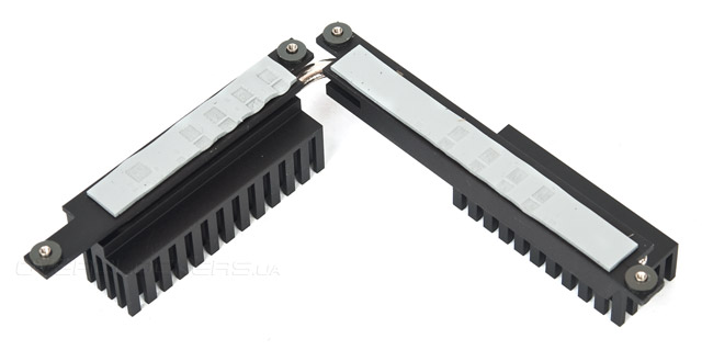 Охладитель силовых элементов представляет собой два разных по площади радиатора, между собой они соединены тепловой трубкой. Вес невелик, но эффективность из-за большой площади рассеивания должна быть высокой. Немного странно выполнен подход к исполнению области непосредственного контакта с транзисторами. Она небольшая, а отпечаток на термопрокладках свидетельствует о не полном контакте с элементами. Всё это очень похоже на почерк, прежде встречавшийся при осмотре Z97I-Plus.