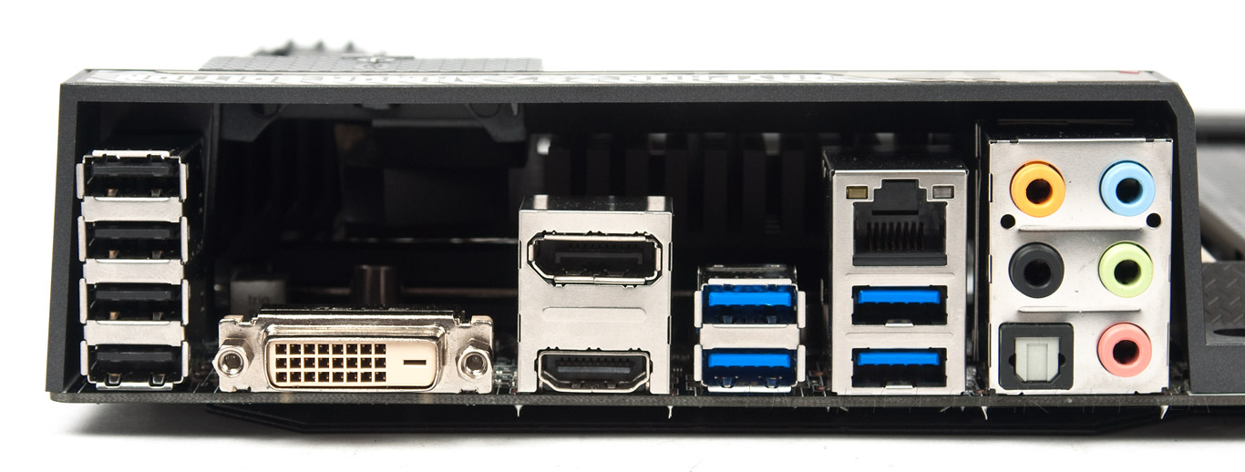 На задней панели находится достаточное количество портов USB обоих ревизий, а число видеовыходов увеличилось до трёх. Выход HDMI оснащён конвертером уровней сигналов ASM1442. Для большинства систем такого набора будет вполне достаточно. Не следует забывать, что часть свободного, на первый взгляд, места зарезервировано для воздуховода.