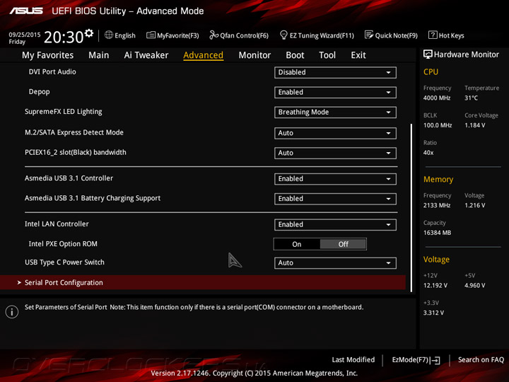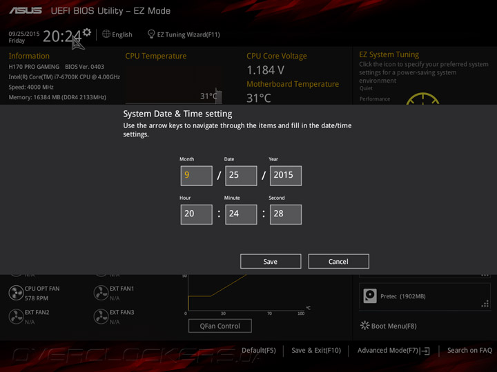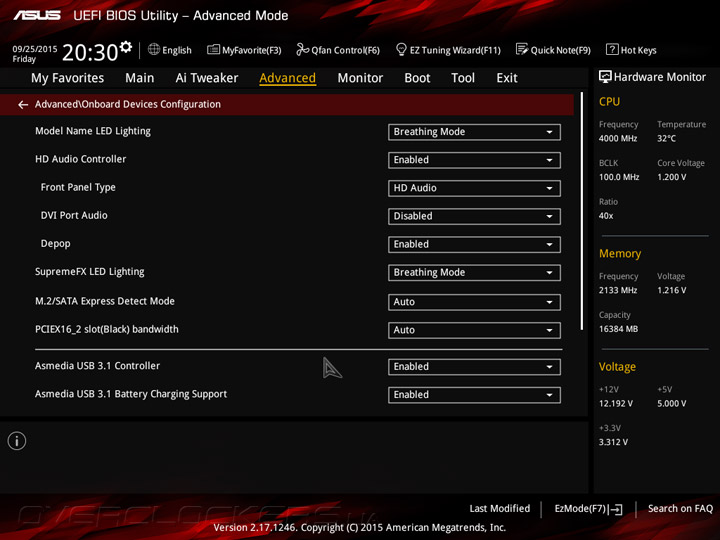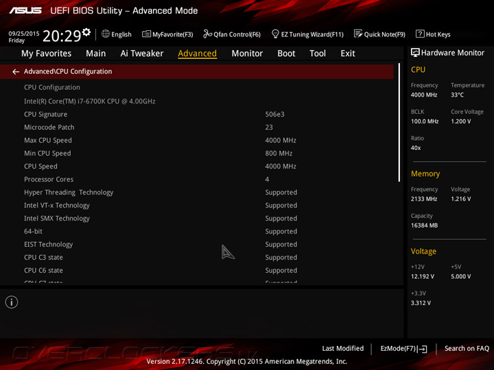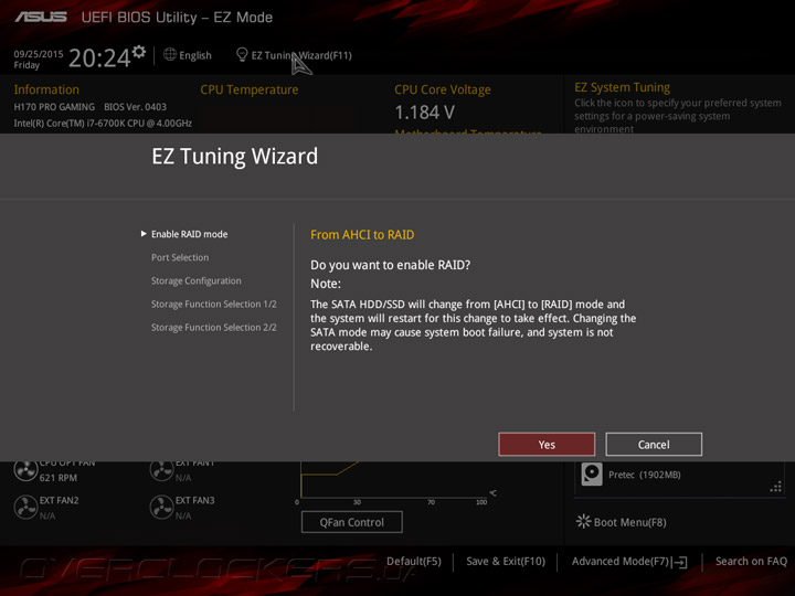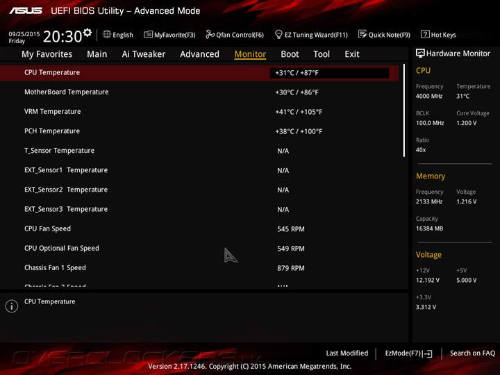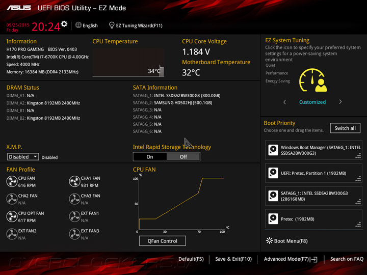 Глядя на меню настройки H170 Pro Gaming, прошивка которой базируется на управляющем микрокоде UEFI разработки AMI, нетрудно заметить сходство с моделями ASUS серии Republic of Gamers, например, Maximus VIII Ranger. Пользовательский интерфейс имеет два режима работы: упрощенный EZ Mode и расширенный Advanced Mode. В упрощённом режиме отображается информация о конфигурации и параметрах быстродействия системы, выводятся показания датчиков аппаратного мониторинга, задаются дата, время и порядок инициализации загрузочных устройств, а также вызывается мастер EZ Wizard для конфигурирования массивов RAID и настраиваются режимы работы вентиляторов.