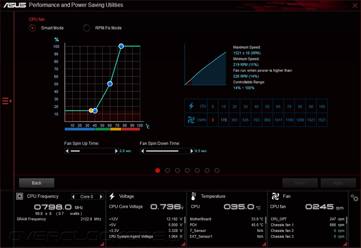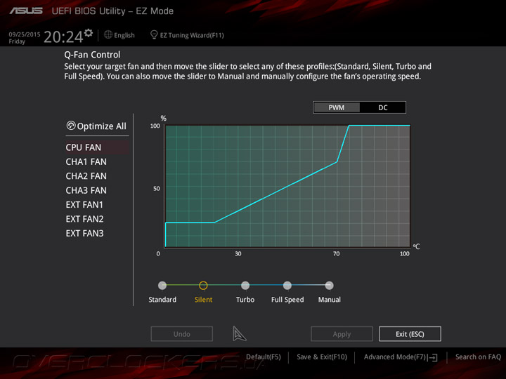 Управление крыльчатками охладителей осуществляется на вкладке Q-Fan Configuration, причем, для всех восьми «карлсонов» можно выбрать один из трех предустановленных режимов работы, либо настроить скорость вращения вручную, привязав обороты к показаниям одной из термопар.