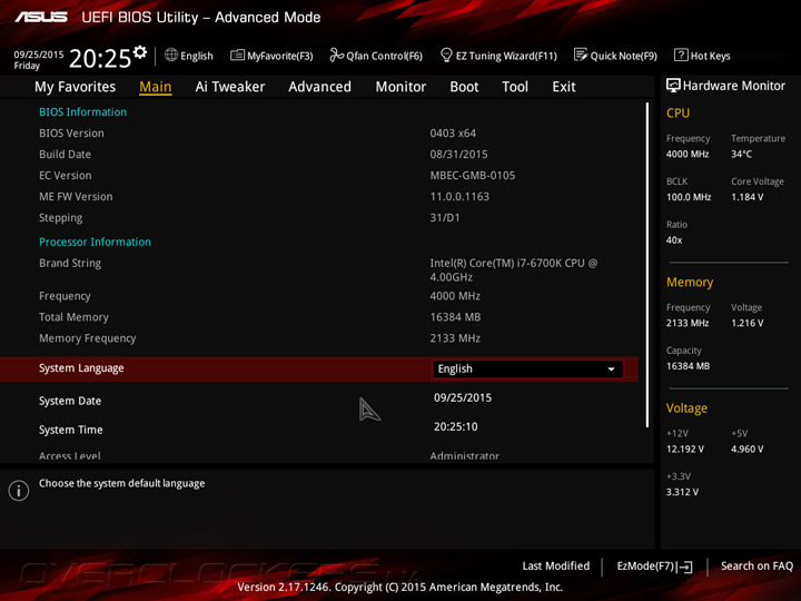 В то время как EZ Mode предлагает лишь базовые возможности управления, режим Advanced дает все необходимые инструменты для тонкой настройки материнской платы. В правой части интерфейса всегда находится информационная панель, на которой отображаются параметры быстродействия центрального процессора и модулей ОЗУ, а также напряжения на основных шинах питания. В разделе Main выводятся подробные сведения о версии управляющего микрокода, задается язык меню настройки и некоторые параметры безопасности.