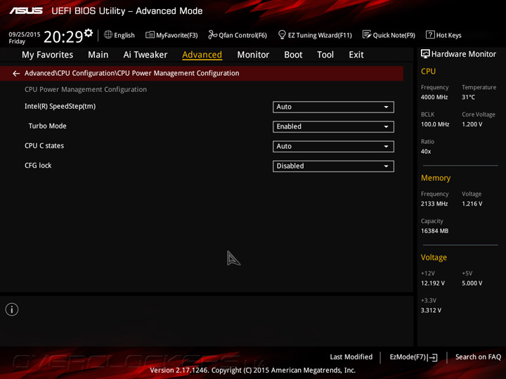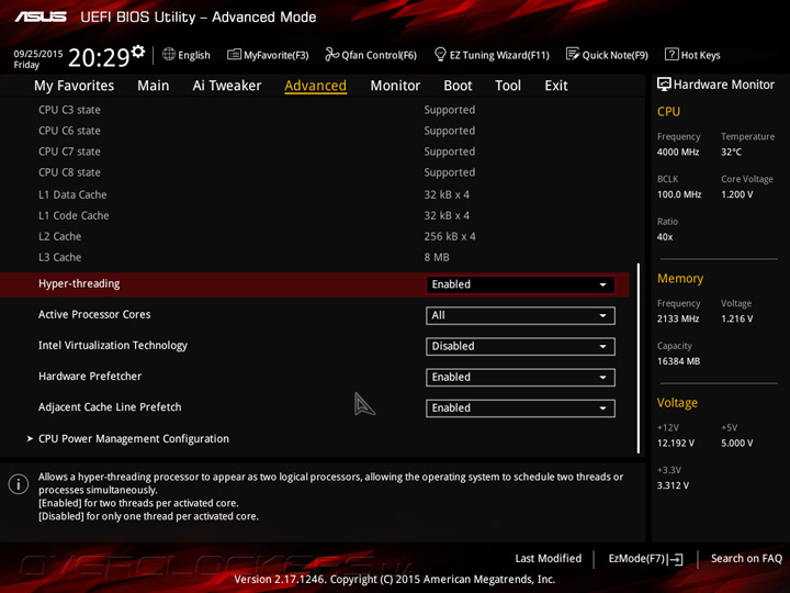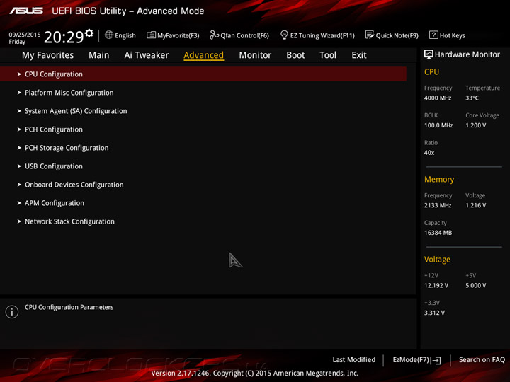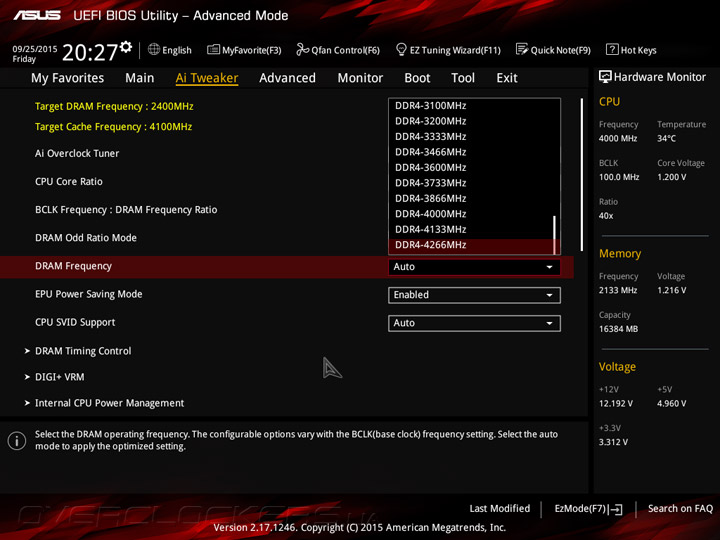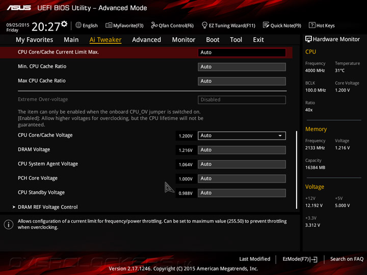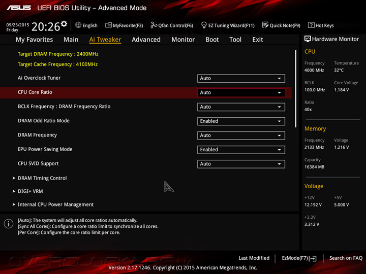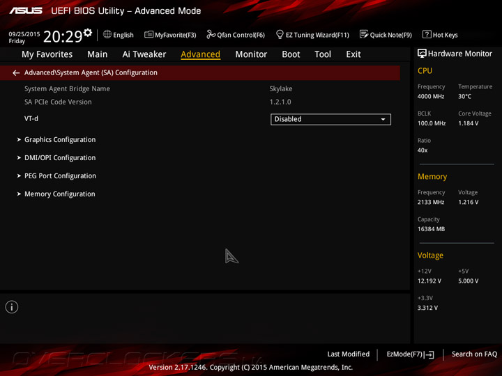 Вкладка Ai Tweaker отвечает за управление параметрами быстродействия, но не разгон, который ограничен на уровне чипсета Intel H170. С одной стороны, в прошивке присутствуют все необходимые опции кроме управления базовой частотой, как то: регулировки коэффициентов умножения вычислительных ядер и кэша L3, но их значения ограничены номинальными величинами даже для процессоров с индексом «К» в названии модели, а подсистема оперативной памяти не может работать быстрее 2133 МГц, хотя в меню присутствуют числа до 4266 МГц включительно. А еще, в отличие от других системных плат ASUS в UEFI Setup новинки нет опции MultiCore Enhancement, повышающей скорость работы в приложениях, не оптимизированных для многопоточного выполнения.