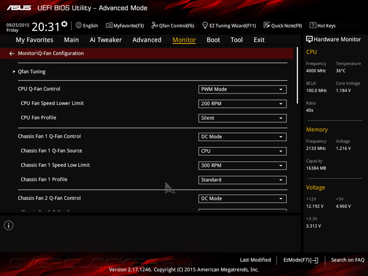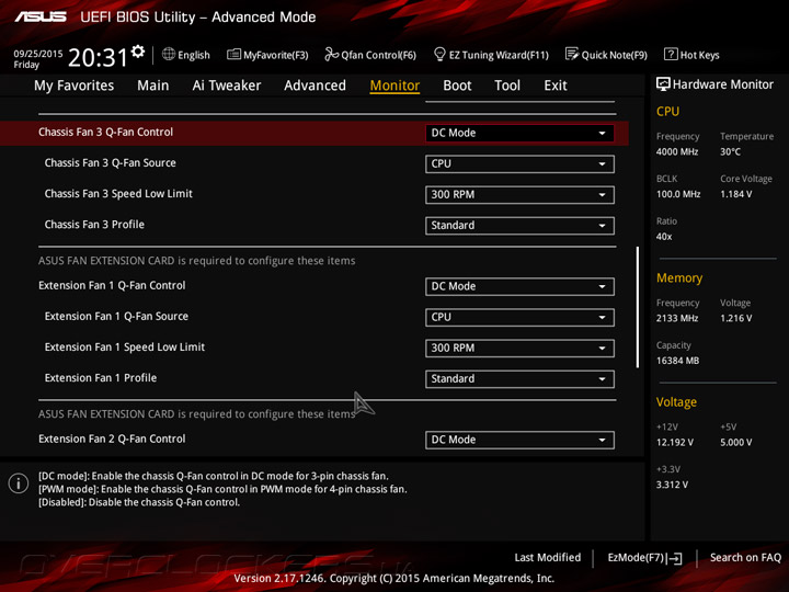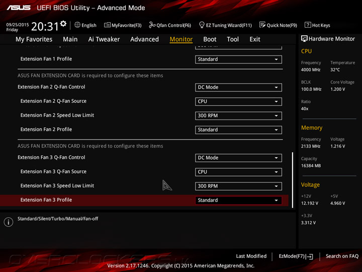 Раздел Monitor, как следует из названия, отвечает за отображение показаний системного мониторинга и управление системой охлаждения. Здесь выводятся значения четырёх встроенных и одного внешнего термодатчика, а также трех опциональных сенсоров, подключаемых к плате расширения Fan Extension Card, скорости вращения пяти основных и трех дополненных вентиляторов, напряжения на процессоре, модулях ОЗУ и шинах питания +3,3 В, +5 В и +12 В.
